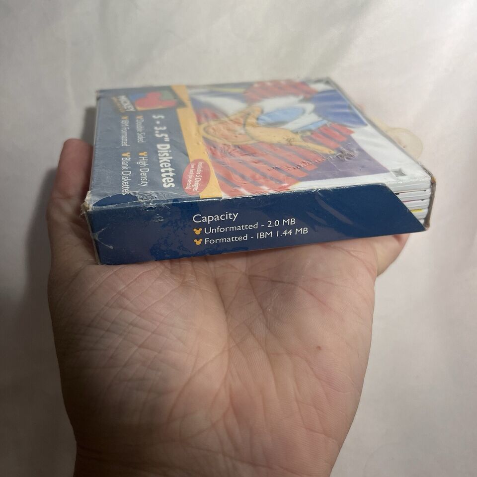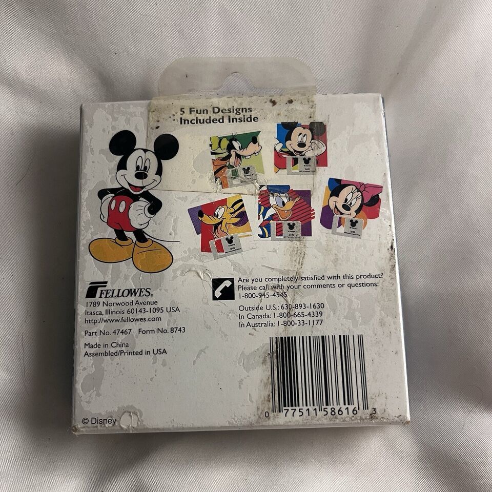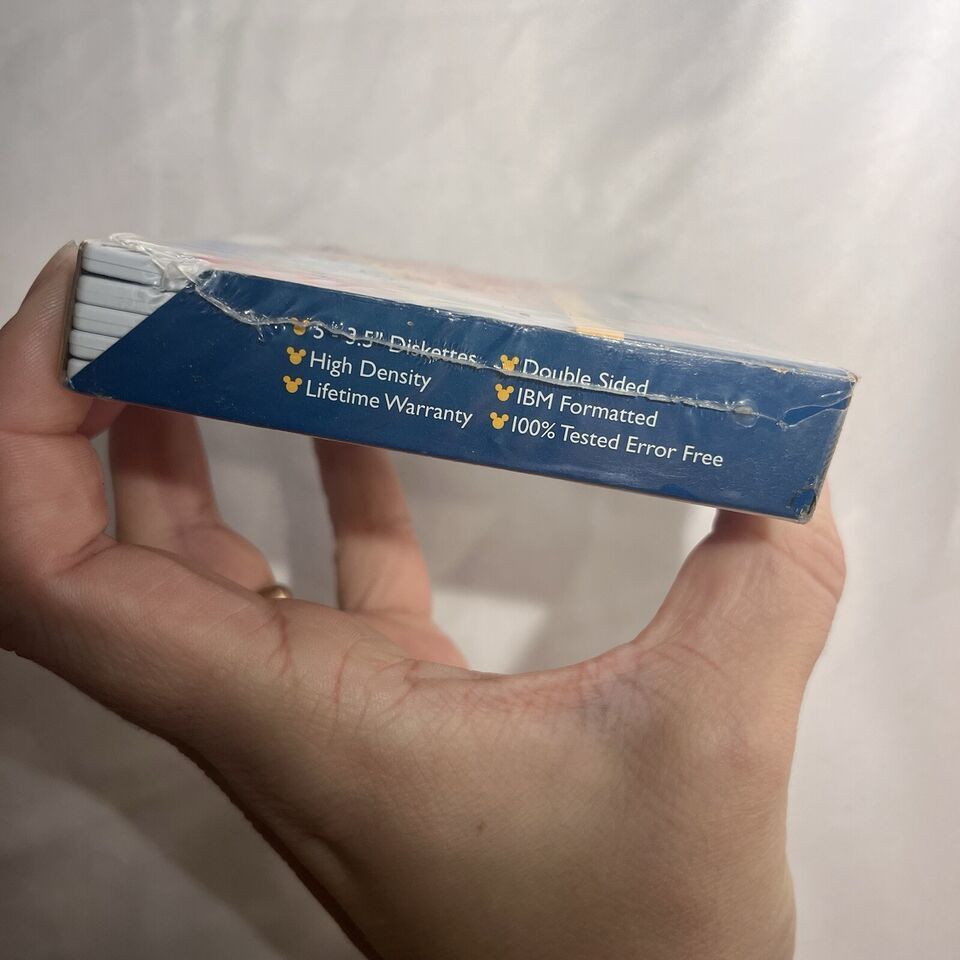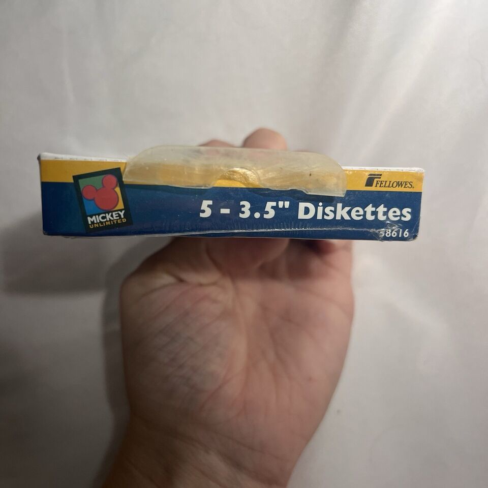 This is a rare find for any Disneyana collector! A full box of vintage sealed floppy diskettes featuring Mickey Mouse and other beloved characters. The set includes 5 unique designs, perfect for adding to your collection or for nostalgic trips down memory lane. The brand is Disney and the theme is Mickey Mouse, making this a must-have for any fan of the franchise. Don't miss out on this opportunity to own a piece of Disney history. They have a full lifetime warranty from the company Fellowes. 100% tested error free. Double sided. High density. IBM formatted.