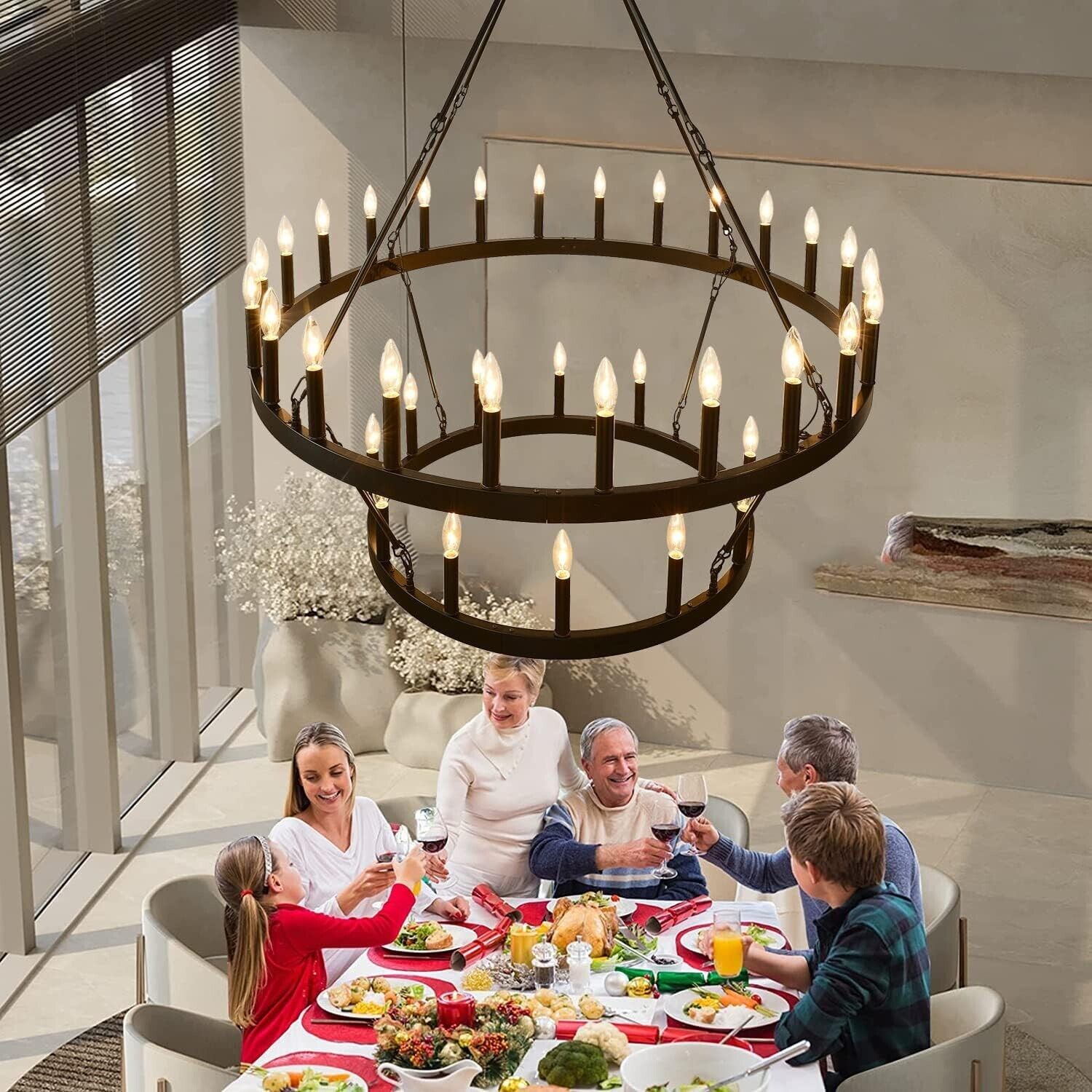 ?APPLICATION?Adjustable height large wagon wheel chandelier is perfect for dining room, living room, kitchen island, bedroom, restaurant, hotel, guest room, villa, duplex, cafe, club, exhibition hall, clothing store, home, foyer or entrance.