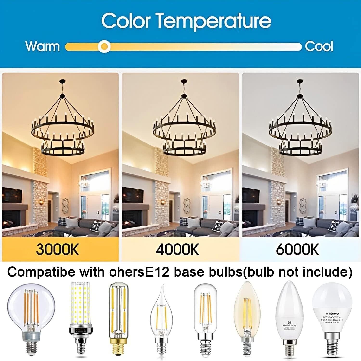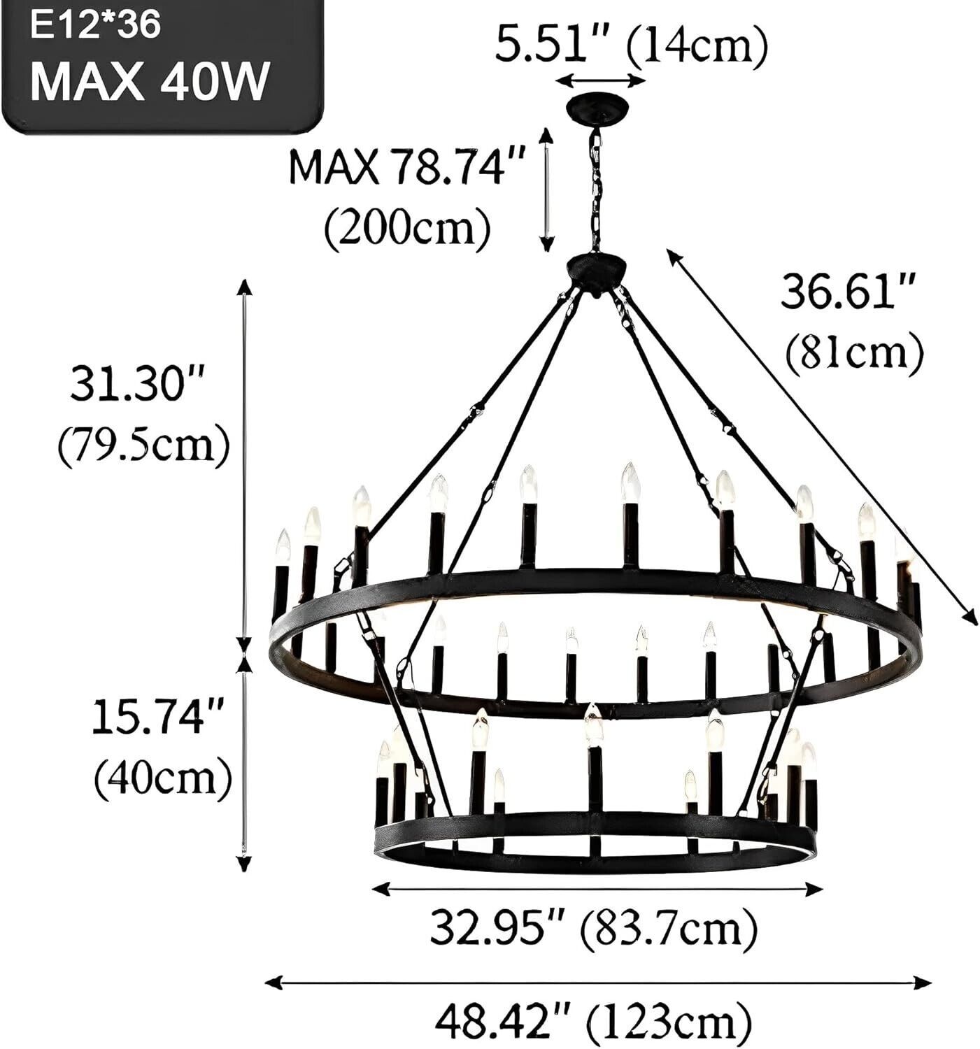 ?Large Farmhouse Rustic Chandelier Bulb Requirements? E12x36-Light design provides 360 light coverage with a maximum 40W bulb (not included) making it the perfect addition to a dining area or front door entryway. Compatible with a variety of bulbs such as incandescent, LED, CFL and halogen bulbs.