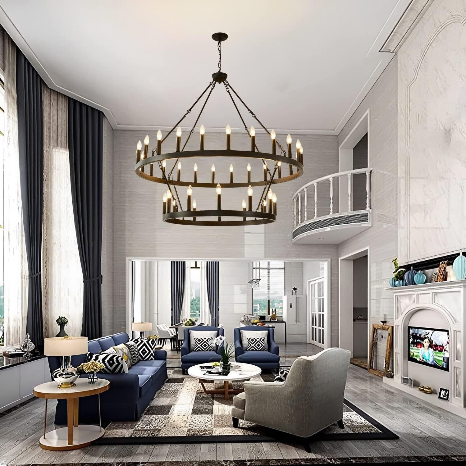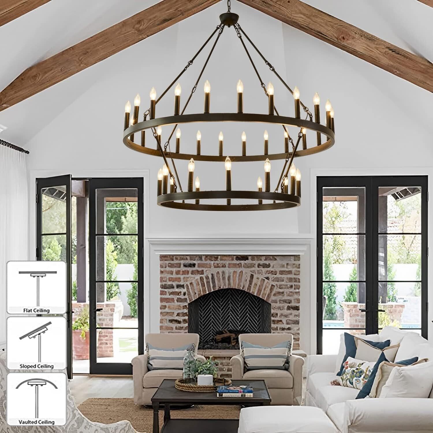 ?Farmhouse Chandelier Size? The diameter of the upper wheel is 48 inches, the diameter of the lower wheel is 32 inches, and the maximum height of the suspension is 125", and the minimum height is 50". This large chandelier looks great on high ceilings and is compatible with flat, sloped, angled and vaulted ceilings.