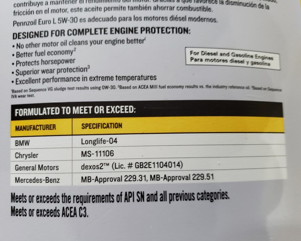 Meets or exceeds the requirements of the following industry specifications: General Motors dexos2 license GB2E1104014; MB-Approval 229.31/229.51; BMW LL-04