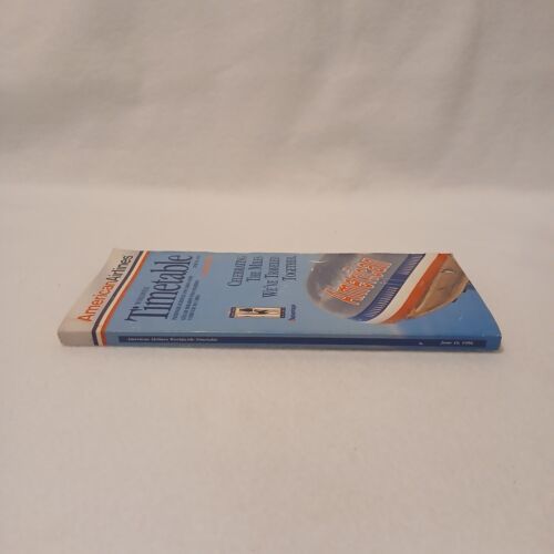 This listing is for a single American Airlines Timetable booklet. This timetable was effective on June 16, 1996. It features passenger flight schedules, seat maps, and cargo guides. The cover is clean with minor wear. The booklet is complete. There are 344 pages. There are no missing or torn pages. The pages are clean.
