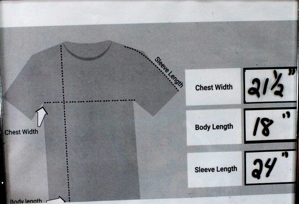 Chest width = 21.5 inches, Body length = 18 inches, Sleeve length = 24 inches