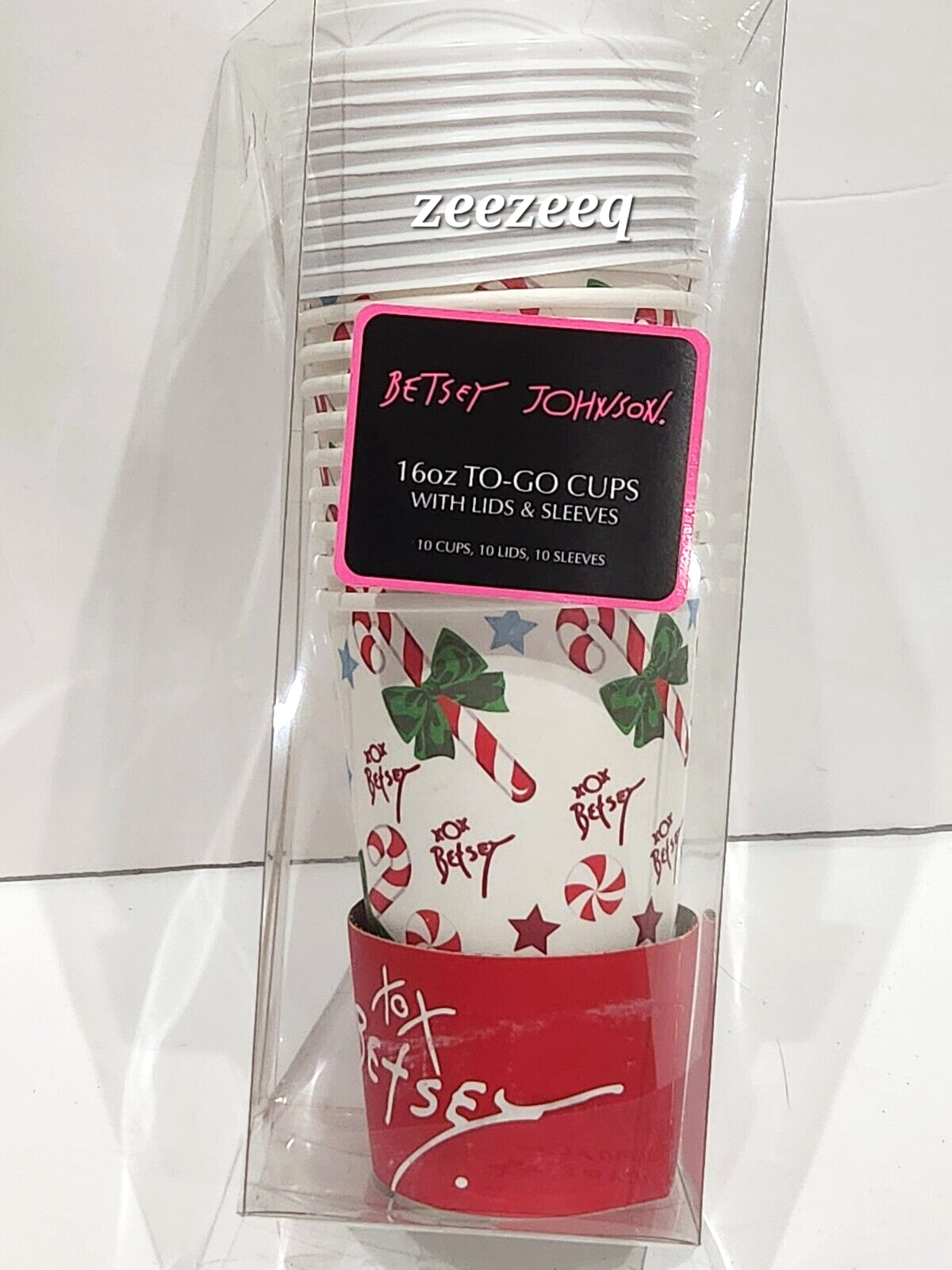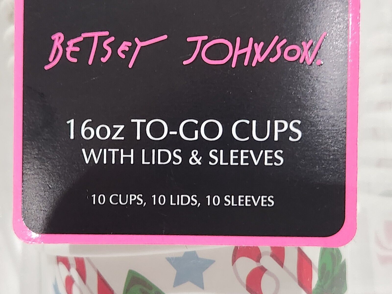 Betsey Johnson To-Go Cups Disposable Coffee 16 Ounce Sleeves Lids with a Candy Cane print. Super cute and look great with a Coffee Bar display.