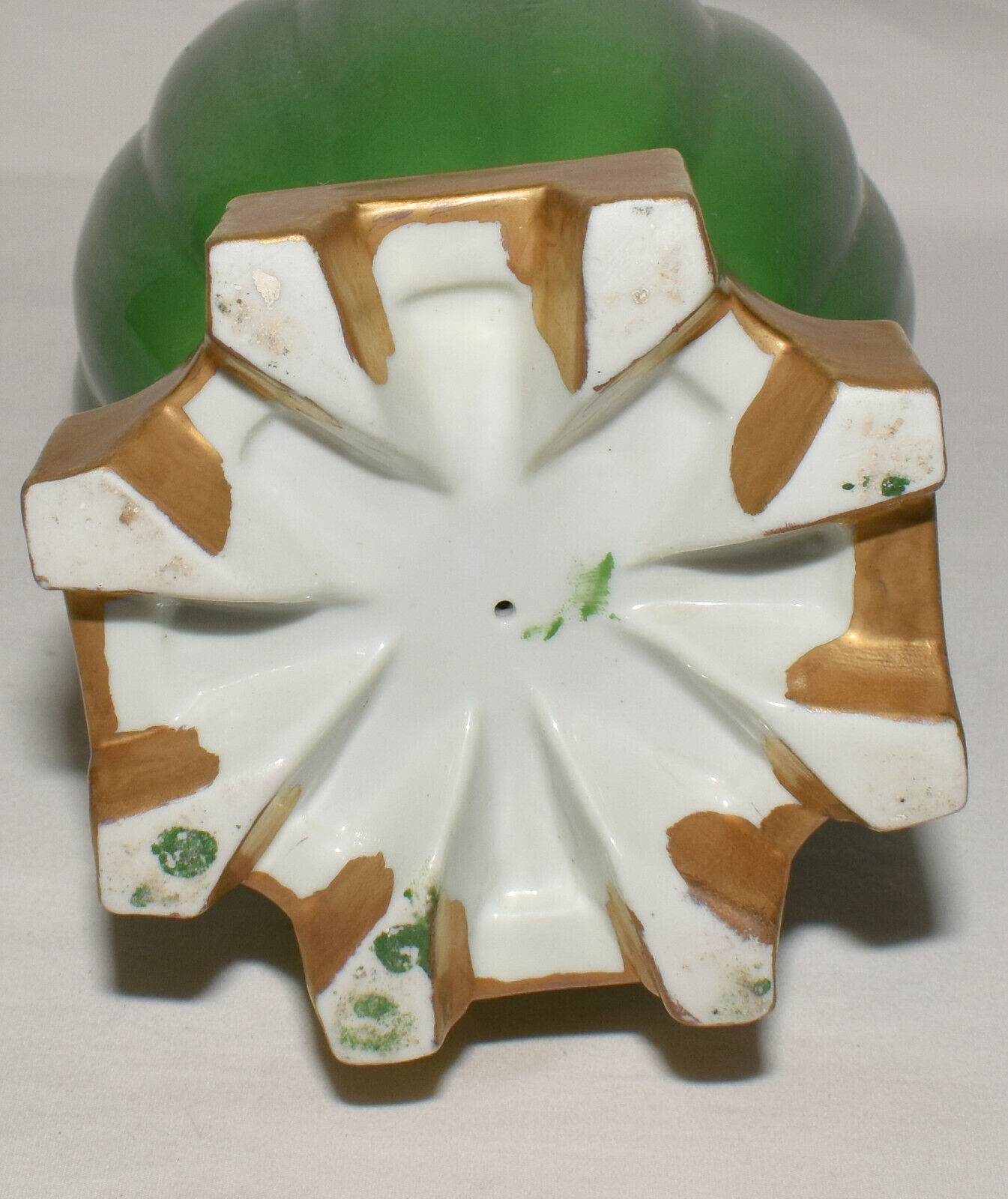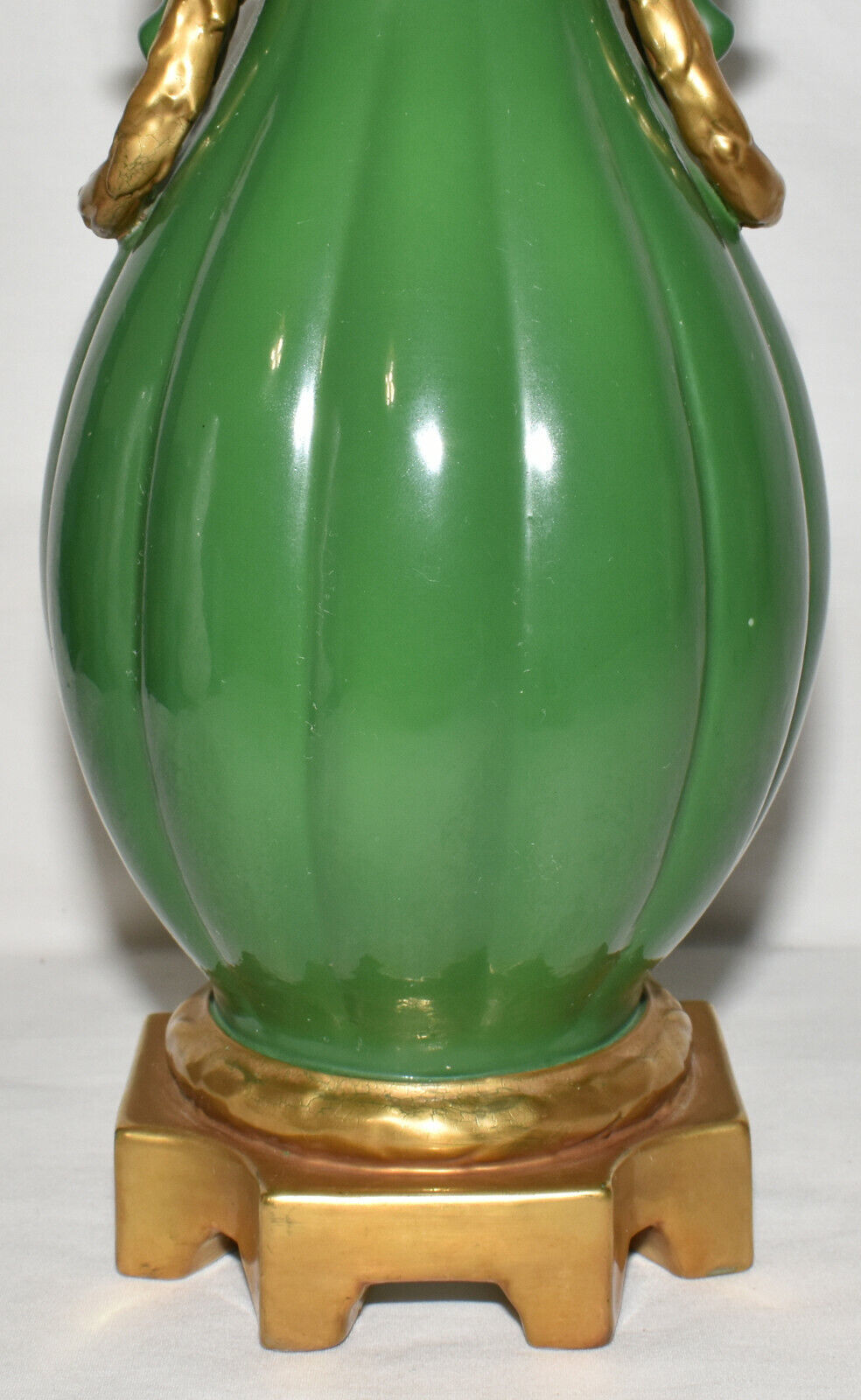 Vintage Green Hand Painted Vase 11" Ribbed Vase Heavy Gilt Trim Ornate Handles