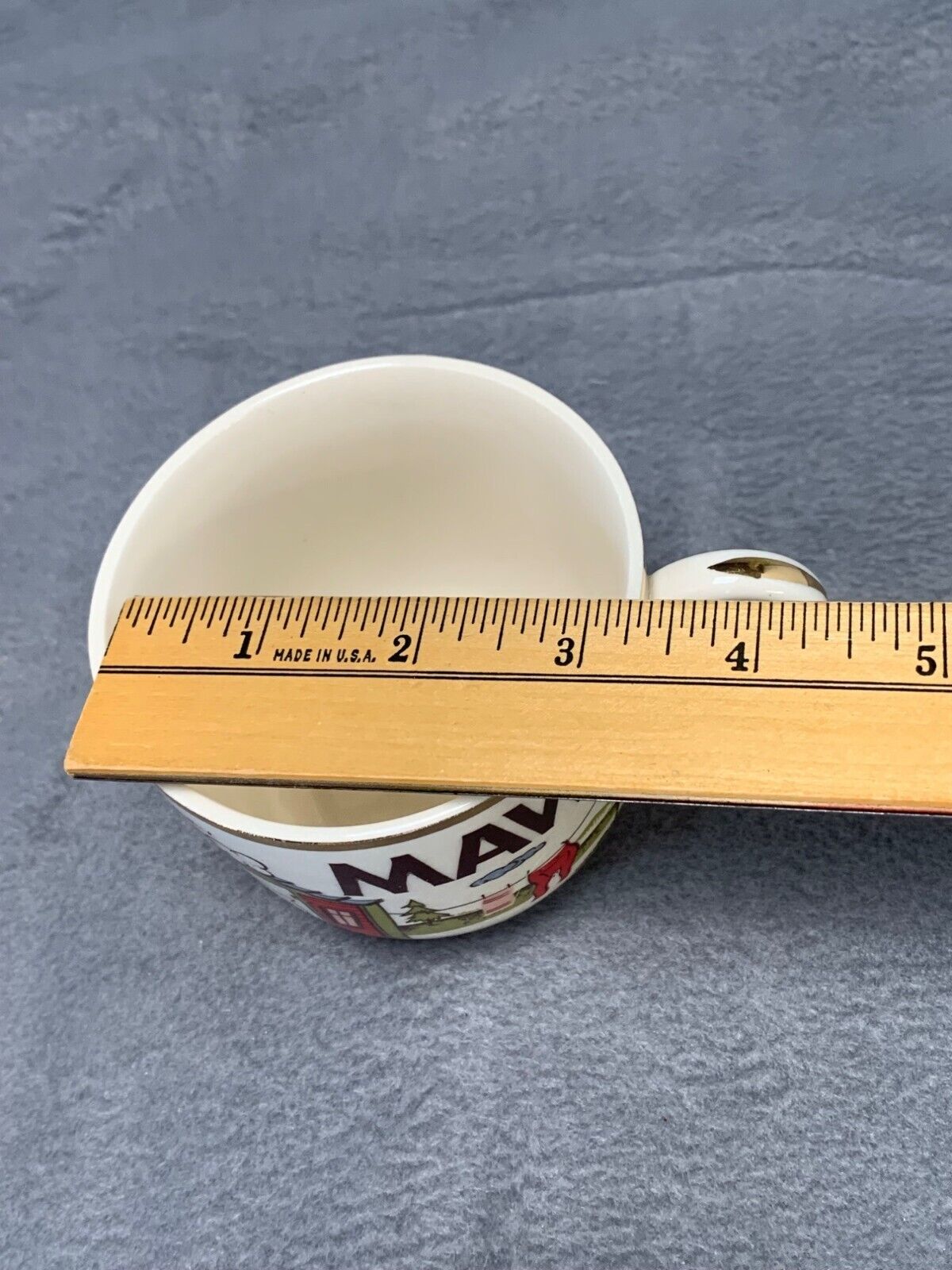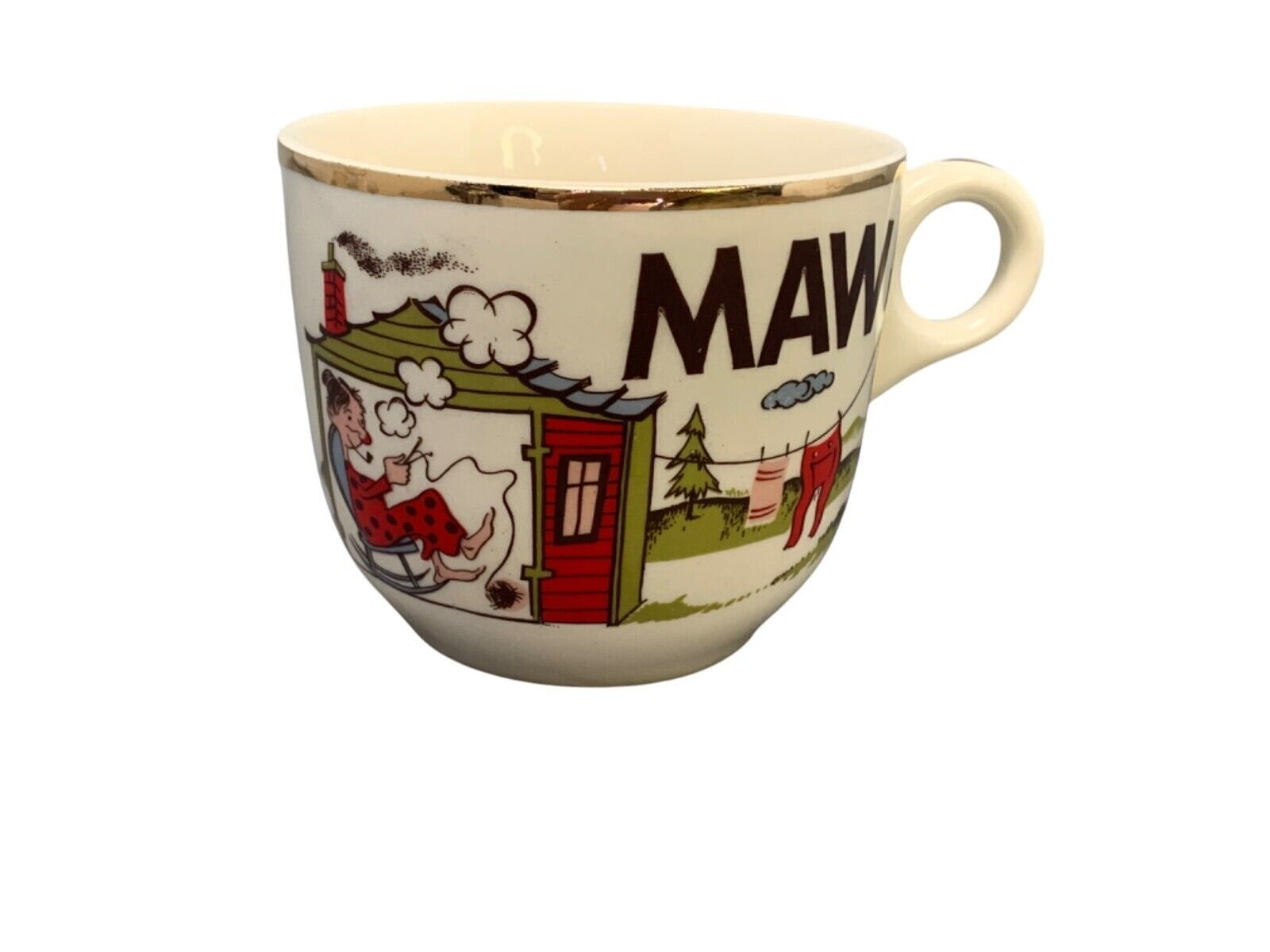 Add a touch of nostalgia to your morning routine with this oversized vintage coffee mug. Featuring a quirky "Maw Come Git Yar Coffee" design, it makes a charming 1960s Wisconsin souvenir. Perfect for collectors or fans of kitschy hillbilly style.
