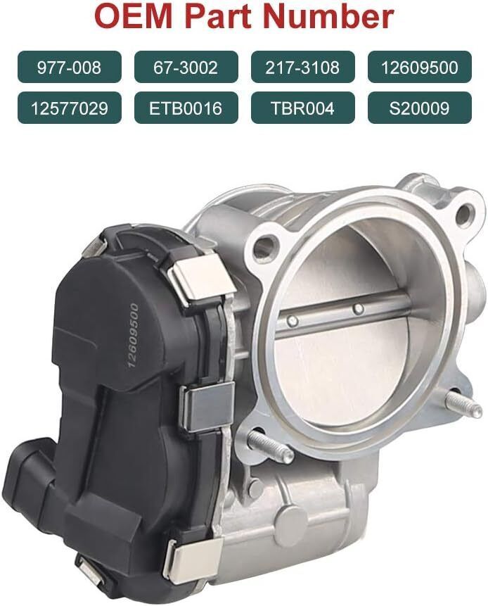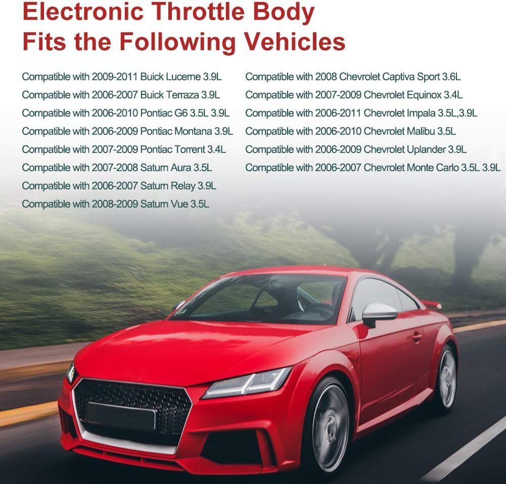 Replacement electronic throttle body assembely - If you are experiencing failing to start, engine stalling,electronic throttle warning light came on, hesitation or power surging on acceleration on your vechile then you may have a problem with your vehicle's throttle body, need to replacing the throttle body. Compatible with 2009-2011 Buick Lucerne 3.9L ,2006-2007 Buick Terraza 3.9L,2007-2009 Chevrolet Equinox 3.4L,2006-2011 Chevrolet Impala 3.5L,3.9L,2006-2010 Pontiac G6 3.5L 3.9L,2007-2008 Saturn Aura 3.5L, More vehcile Please See Product Description Replaces part OEM 977-008 67-3002 217-3108 12609500 12577029 ETB0016 TBR004 S20009 Built-in quality motor ensure long-term operation.Green gasket keep throttle body and tube tightly connected. Before placing the order, please check your car model in the "amazon confirmed fit" in the top left corner. please make sure to match the exact part numbers between this part and the part that you are replacing