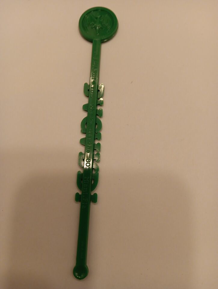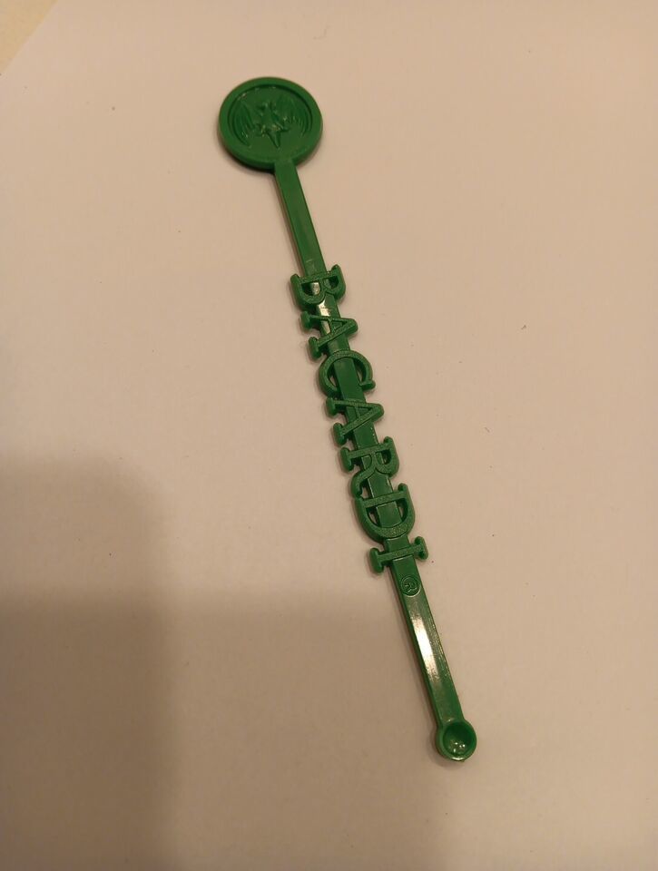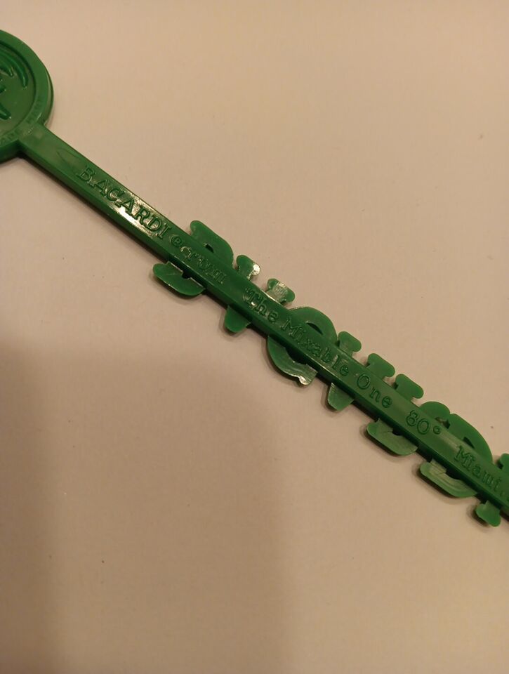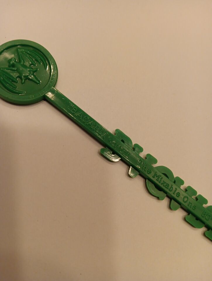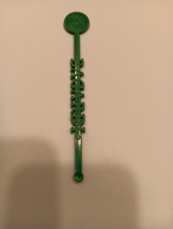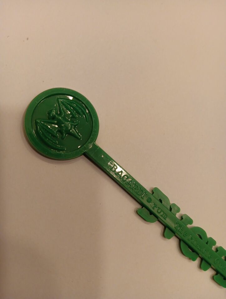 Bacardi Swizzle Stick Drink Stirrer Bat Logo Green. Back States "Bacardi Rum The Mixable One 80 Miami Fla. Very nice, green plastic, 6 inches. I also have 2 others like this but they state Puerto Rica on back.