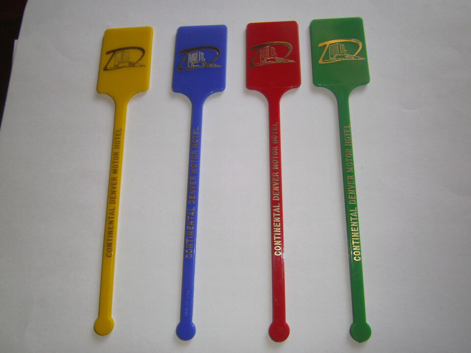 Four (4) Continental Denver Motor Hotel Swizzle Sticks Drink Stirrers SPIR-IT, 4 Colors, blue, green, yellow, red. Very nice, measure 6.25 inches.