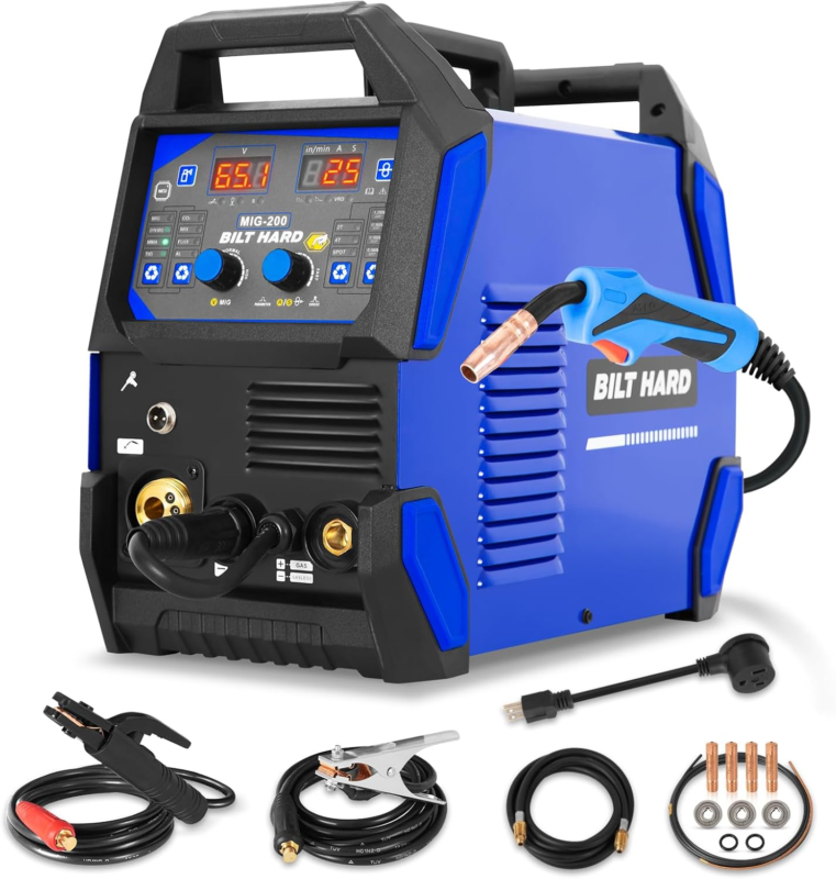 The BILT HARD MIG-200 welding machine has multiple functions of MIG, flux-cored, stick, lift TIG, and combines self sensing and 110V/220V dual voltage.