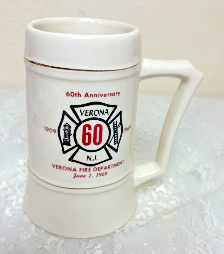 1969 Verona Fire Department 60th Anniversary Beer Stein - 5.75" Tall x 2.75" in Diameter at top. 3.25" in Diameter at Bottom. Very Good Used Condition - No Cracks or chips - See photos for further description.
