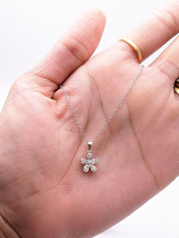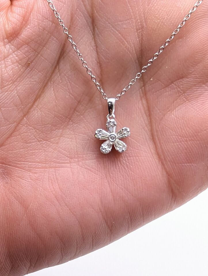 A Dainty Elegant Natural Round Baguette Diamonds Flower Pendant Necklace