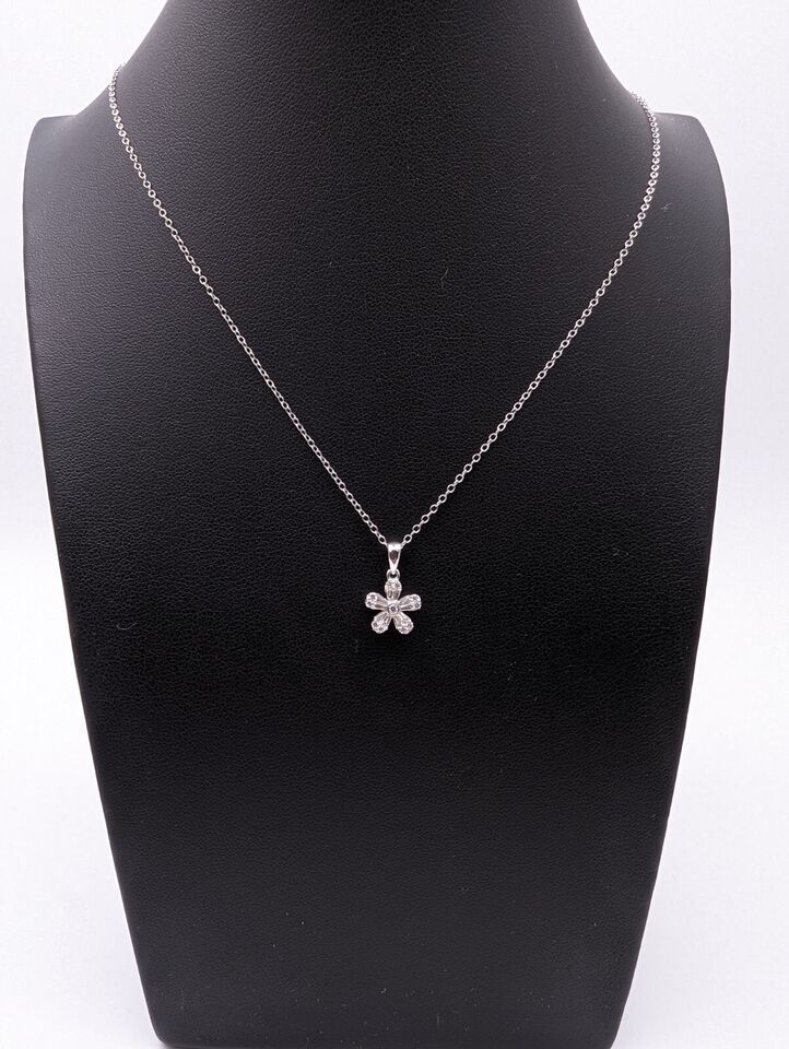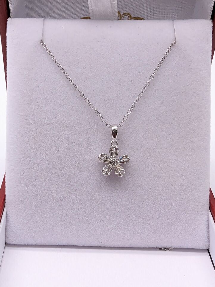9ct White Gold Natural Round & Baguette Diamonds Flower Pendant Necklace 0.26cts