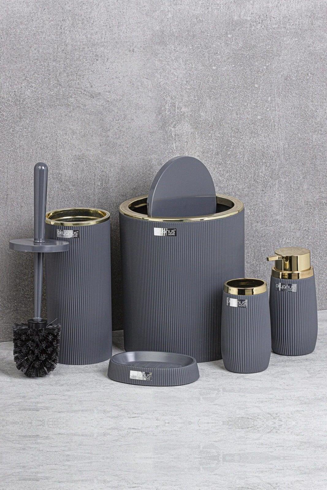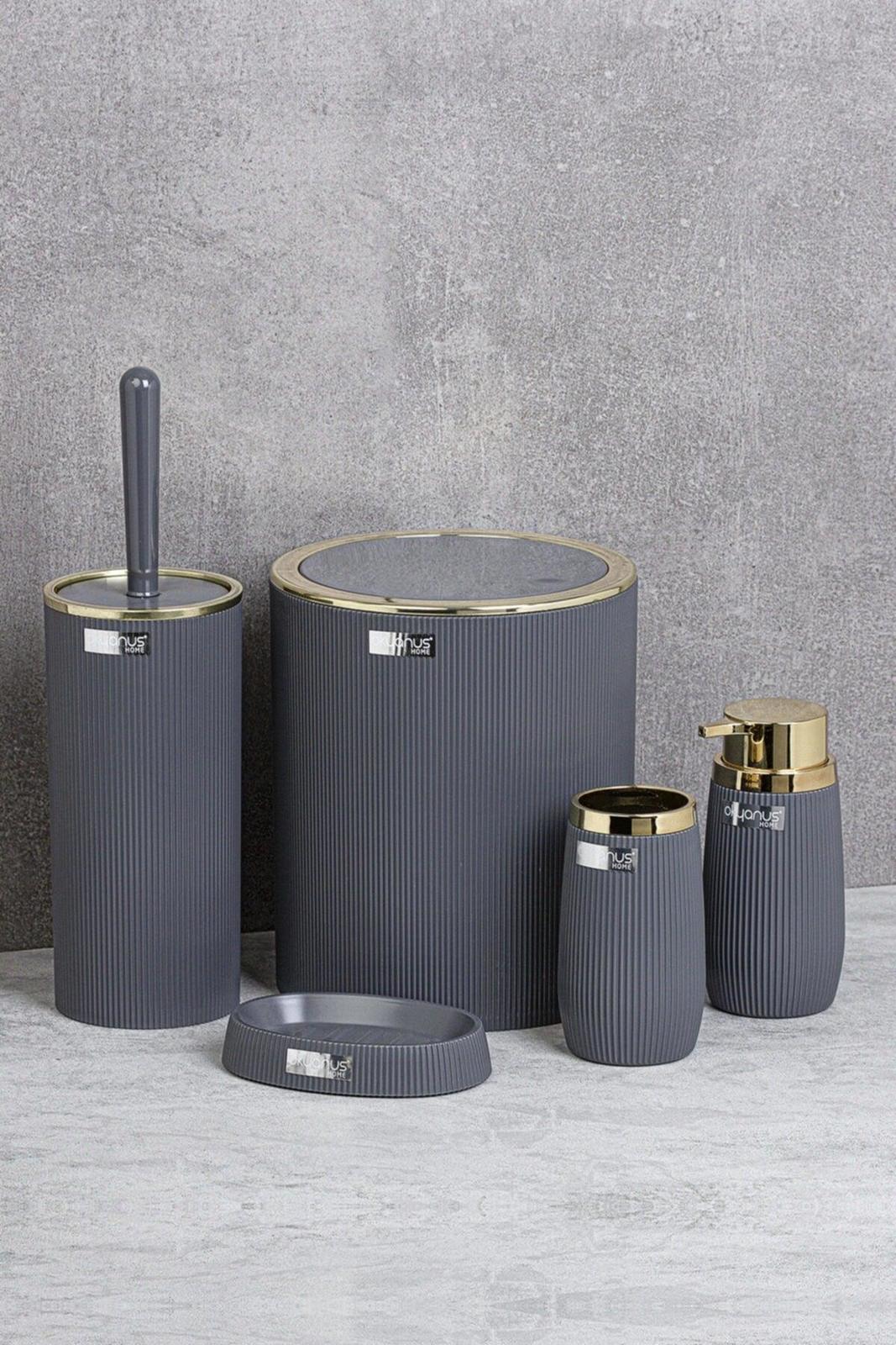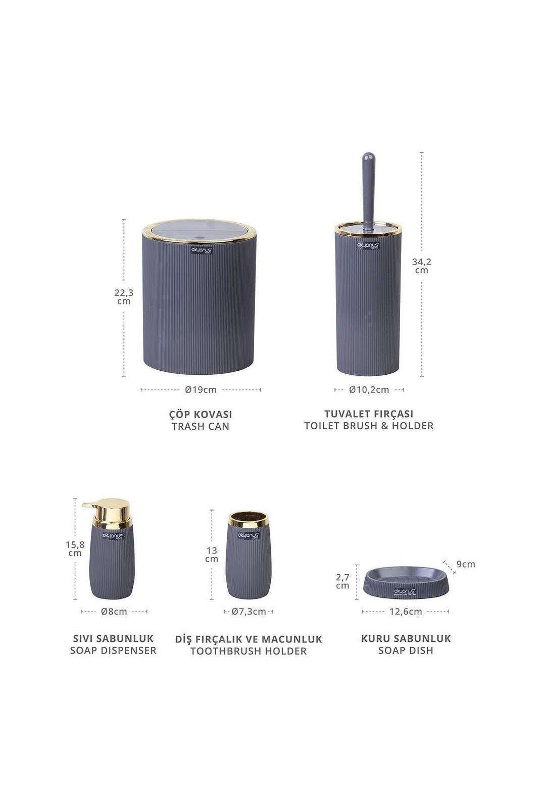 Ocean home gold series anthracite striped round 5 piece bathroom set product dimensions ? toothbrush holder: 13x7.3 cm ? liquid soap dispenser: 15.8x8 cm ? solid soap dish: 2.7x12.6x9 cm ? toilet brush: 34.2x10.2 cm ? dustbin : 22.3x19 cm product features ? material : hard plastic raw material product content ? 1 dustbin ? 1 toothbrush holder ? 1 solid soap dispenser ? 1 liquid soap dispenser ? 1 toilet brush More than 10 stocks to be sold at the campaign price The price listed is valid until 17 October 2023.