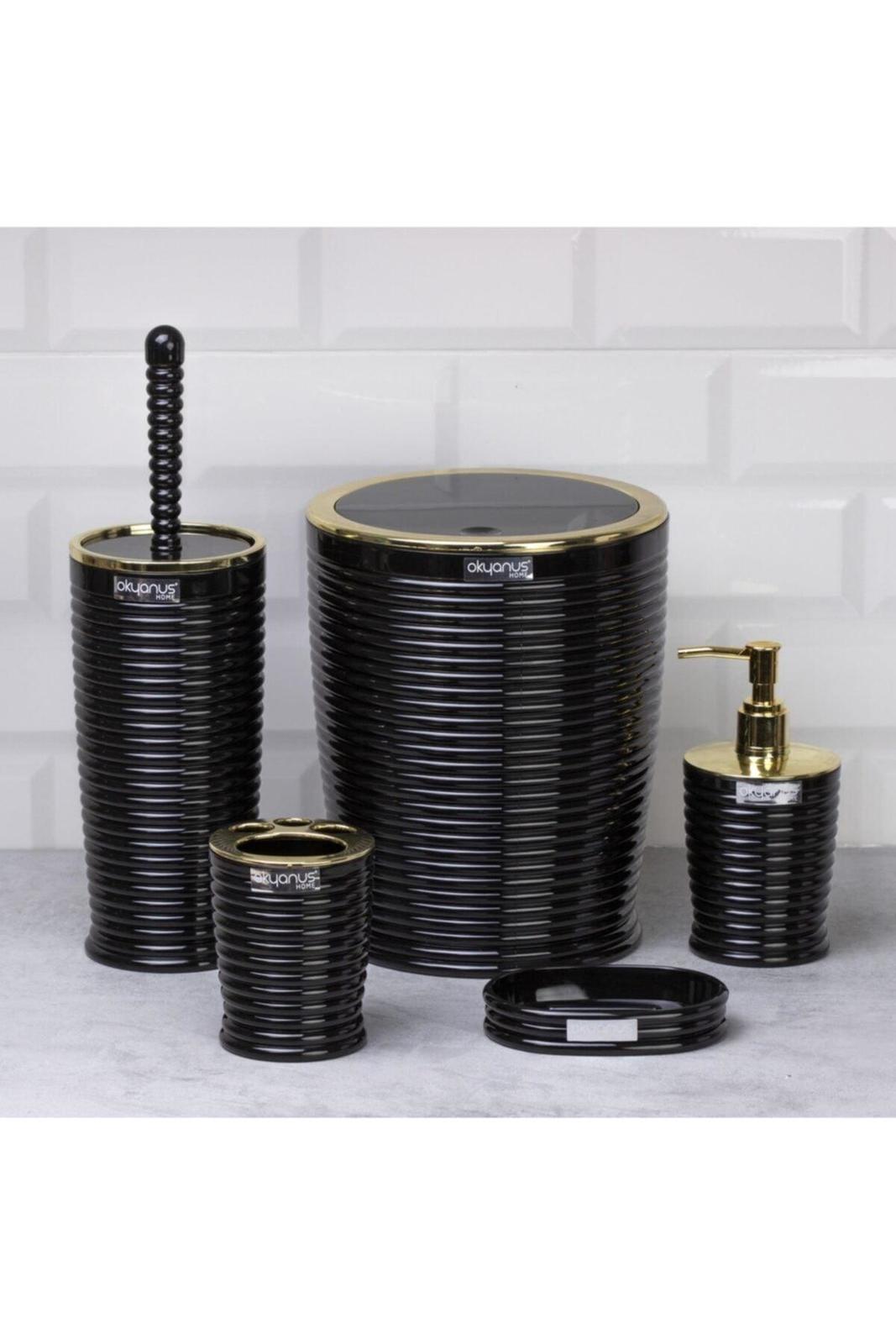 Ocean home black elegans gold 5 piece bathroom set product dimensions ? toothbrush holder : 8x10 cm ? liquid soap dish : 8x17 cm ? solid soap dish : 12x9 cm ? toilet brush : 10x34 cm ? dustbin : 19x23.5 cm product features ? material : hard plastic raw material product content ? 1 trash can ? 1 toothbrush holder ? 1 solid soap dispenser ? 1 liquid soap dispenser ? 1 toilet brush More than 10 stocks are offered to be sold at the campaign price. The listed price is valid until 17 October 2023..