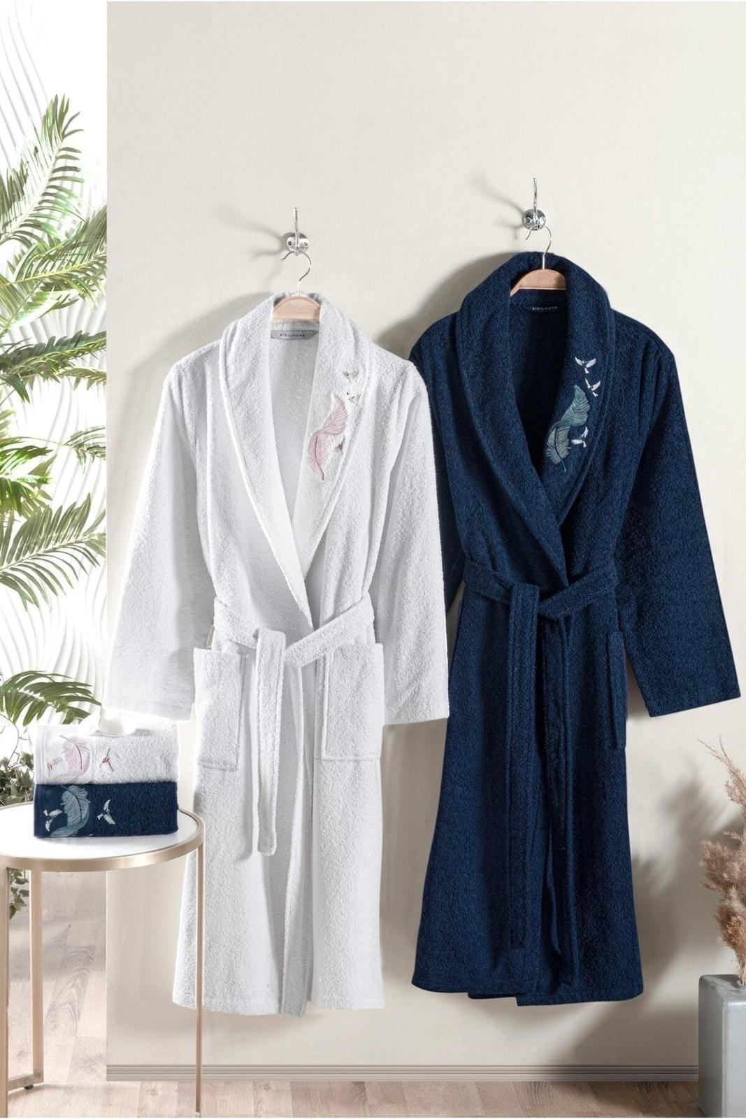 :100% Cotton Ki??l? offers you bathrobes with beautiful designs in its towel collection so that you can feel the quality in the bathroom. Bathrobes, which are products used for drying and maintaining body temperature, are among the products that attract attention with their ease of use and practicality. The first point to consider when choosing a bathrobe is the type of fabric. Its 100% cotton and texture that caresses your skin makes you enjoy every moment while using it. Consisting of two bathrobes and two head towels, the set brings your elegance to the bathroom with its eye-catching design and feather embroidery. Bathrobe 2 Pieces Head Towel 2 Pieces Bathrobe Dimensions: Female: S/M Shoulder Width: 44 cm Height: 124 cm Male: L/XL Shoulder Width: 46 cm Height: 126 cm Head Towel Dimensions: Width: 50 cm Height: 90cm