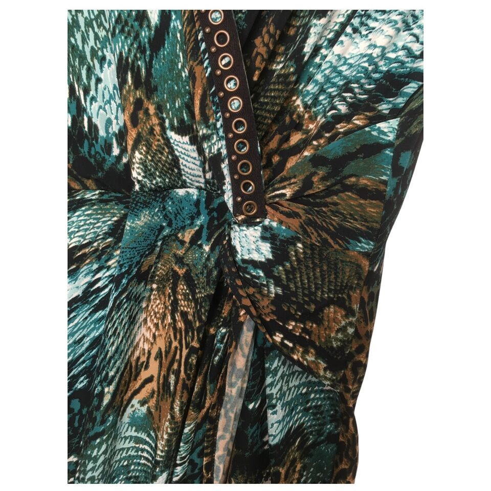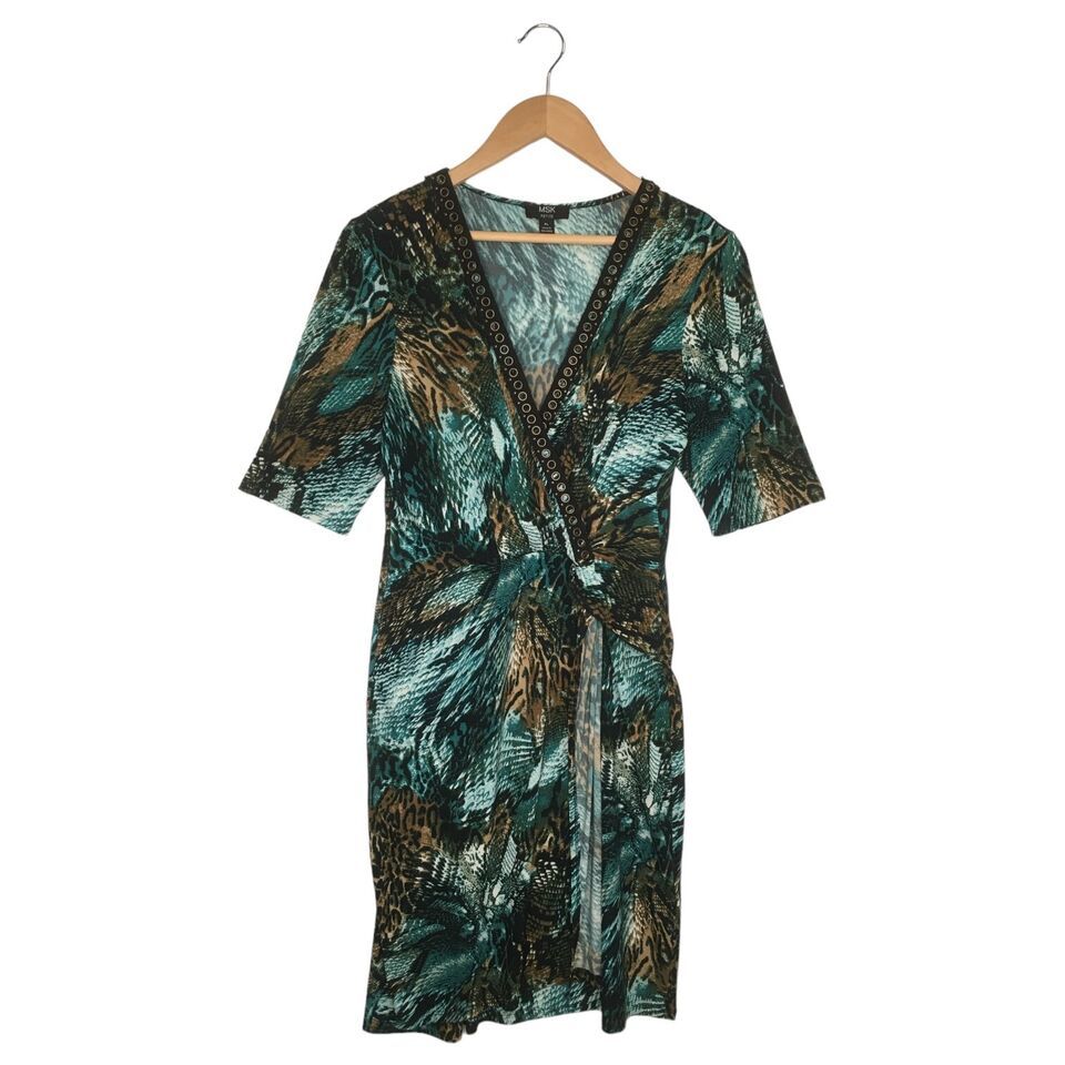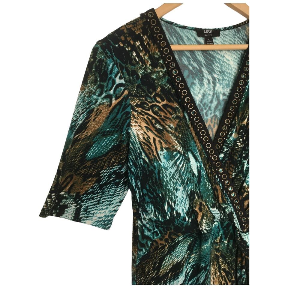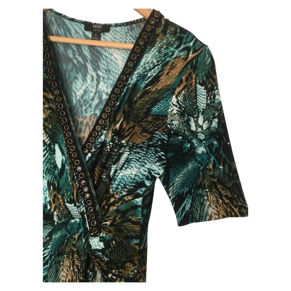 MSK Dress Womens L Petite Animal Faux Wrap V Neck Studded Short Sleeve Green