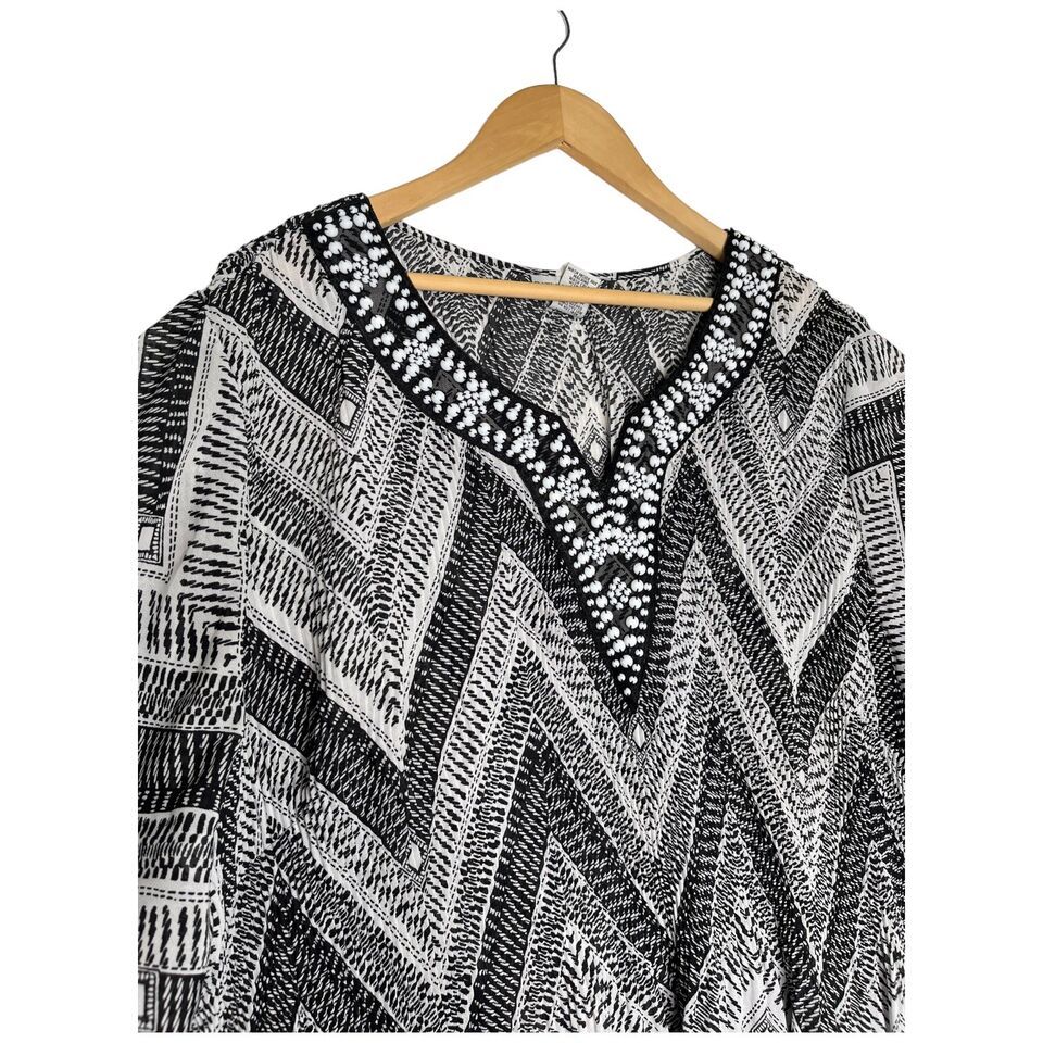 Catherine's Women's Blouse V Neck Beaded Chevron Shark Bite Hem Black.