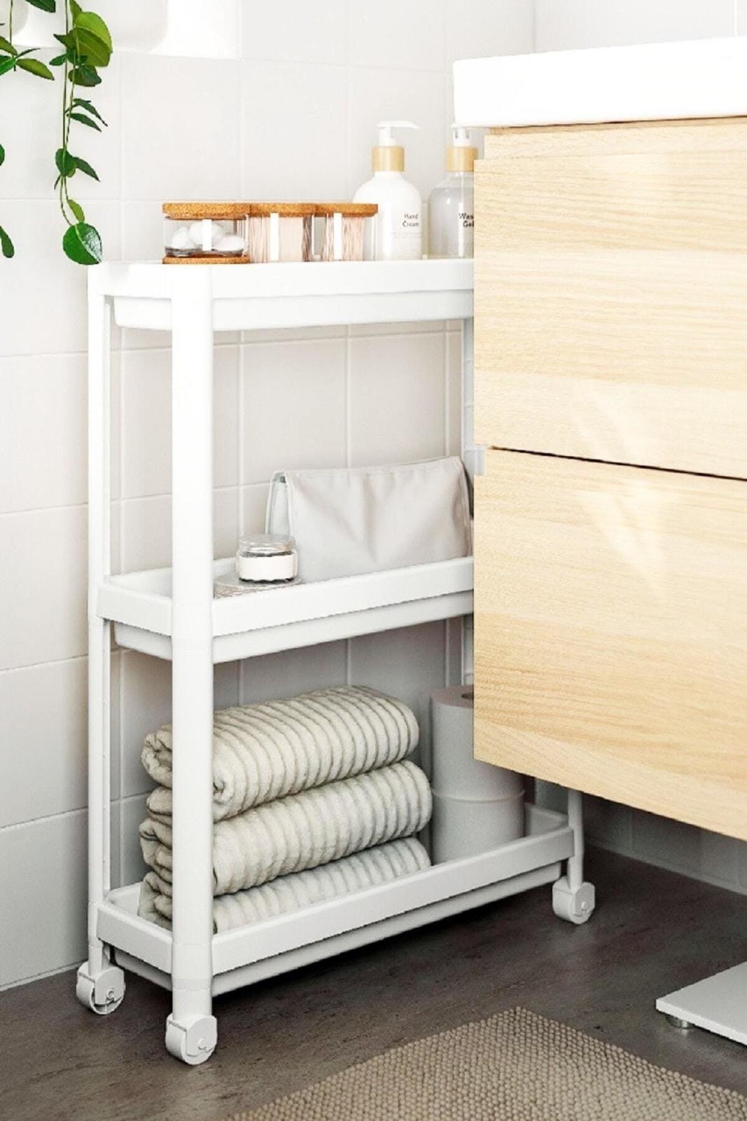 Vesken Wheeled Shelving Unit 3 Tiers White Bathroom Shelf Kitchen Shelf Serving Table Organizer ? ยท Dimensions Width: 54 cm Depth: 18 cm Height: 71 cm Distance Between Shelves: 30 cm ยท ยท You can assemble the service trolley quickly and easily by putting the parts together without using any tools. ยท ยท Thanks to its solid structure and four wheels, you can carry the kitchen trolley and use it wherever you want. It can even be used comfortably in narrow spaces due to its small size. ยท ยท Thanks to the high sides of the shelf, everything from shampoo and conditioner to a bath sponge can stay in place. ยท ยท Perfect for small bathrooms. ยท ยท Material Polypropylene plastic ยท ยท Fits into the smallest bathrooms. There is plenty of space on the shelves for all your toiletries, from shampoo bottles to soap and small items. More than 100 stocks are available for sale at the campaign price. Listed price is valid until 17 October 2023.