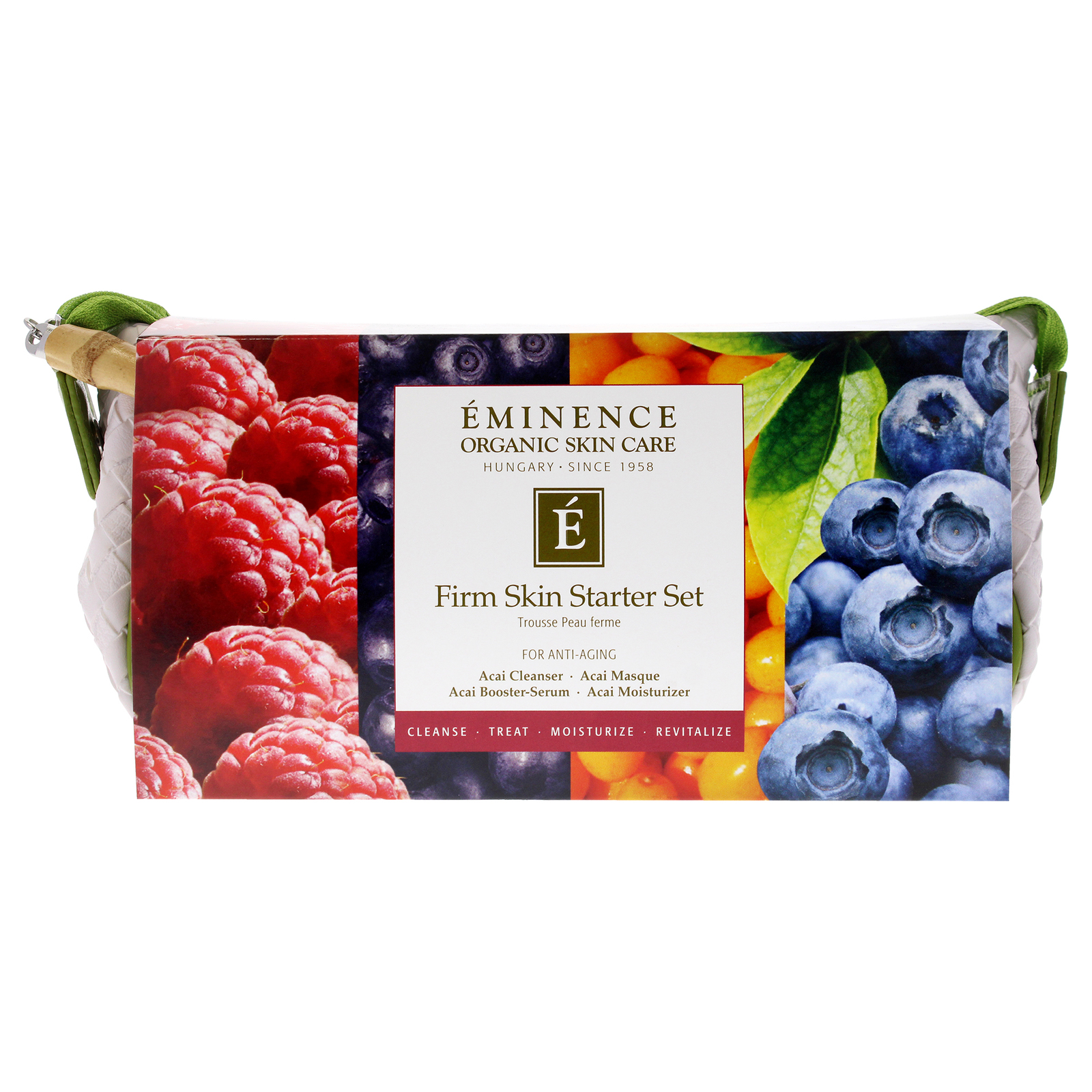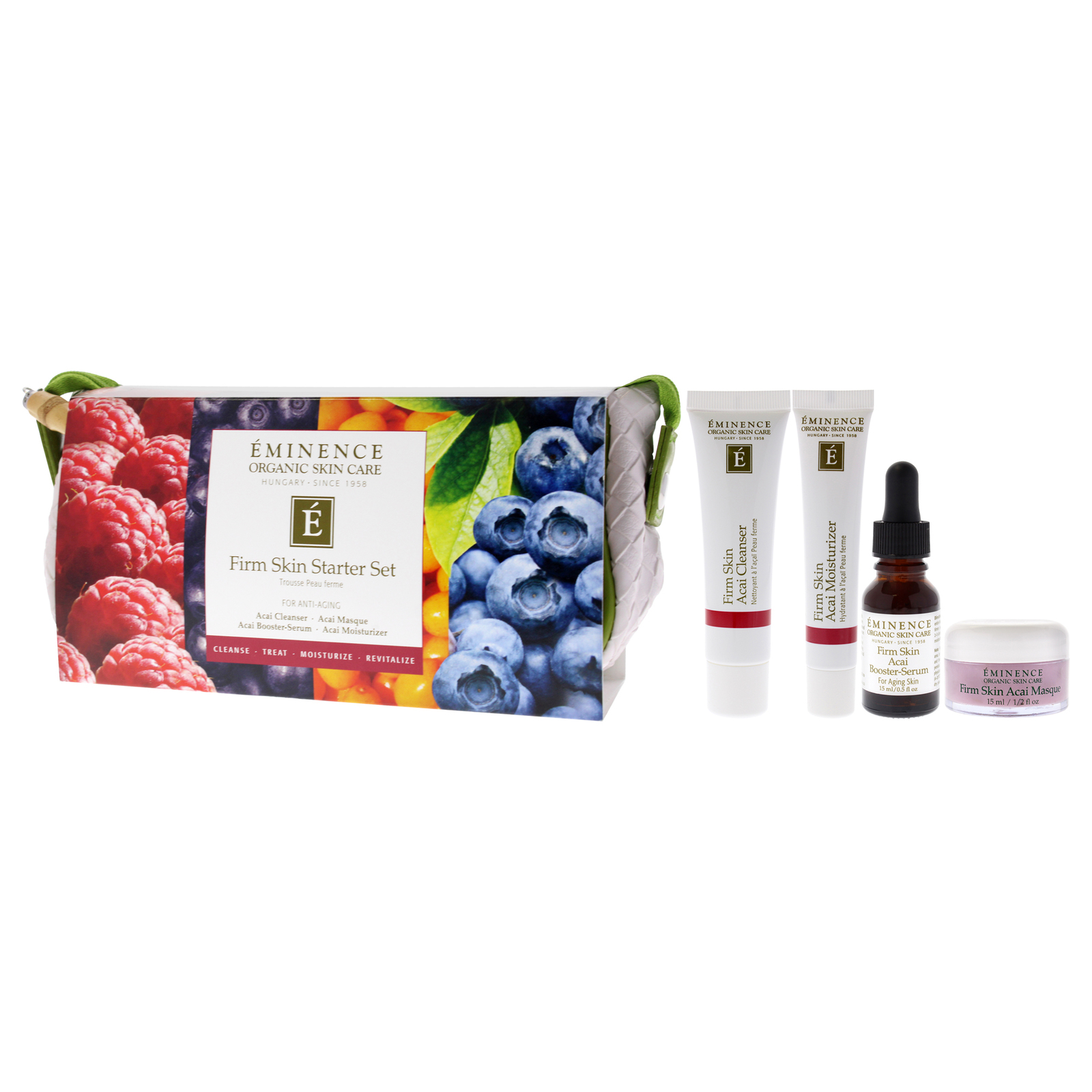 Our Firm Skin Starter Set is beautifully packaged with a one-months supply of targeted organic products to treat aging skin types. Eminence is constantly innovating our product formulations to deliver the best results. Hydrate and nourish aging skin with rich shea butter and skin-plumping botanical hyaluronic acid. Targeted formulas Homeostatine and Biocomplex2 boost the appearance of elasticity for younger-looking skin.