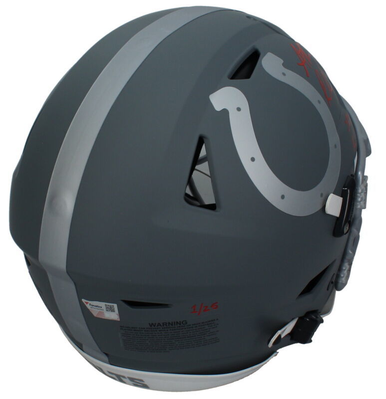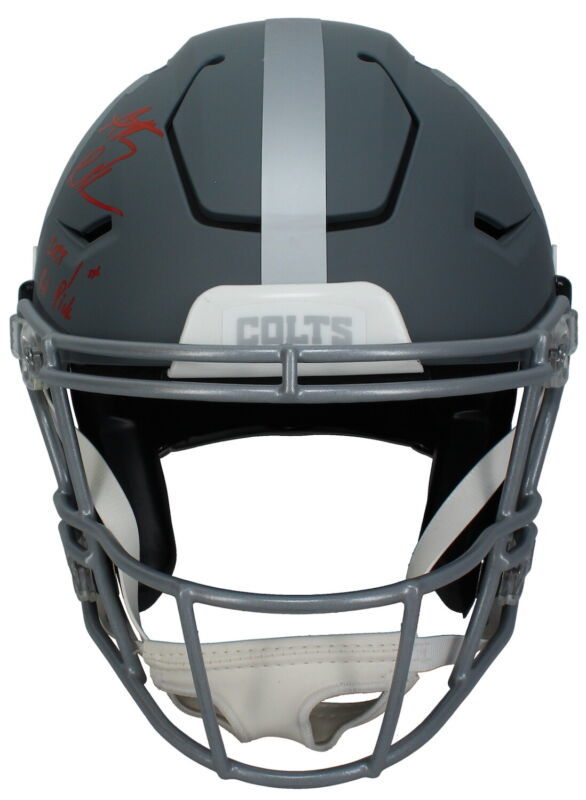 This authentic Slate Speed Flex helmet has been personally hand-signed by Anthony Richardson with the added inscription "2023 1st Rd. Pick." It is officially licensed by the National Football League and comes with an individually numbered, tamper-evident hologram from Fanatics Authentic. To ensure authenticity, the hologram can be reviewed online. This process helps to ensure that the product purchased is authentic and eliminates any possibility of duplication or fraud.