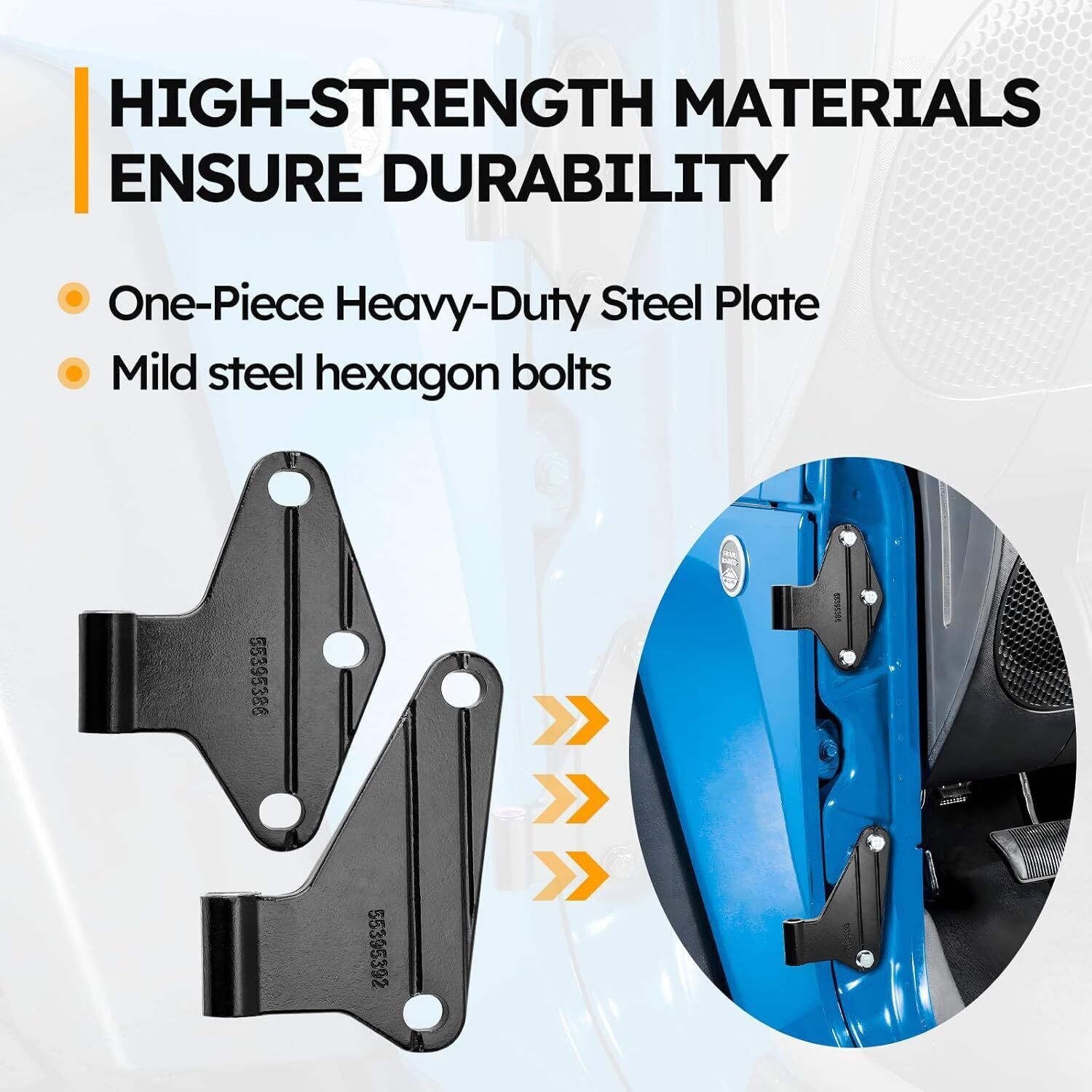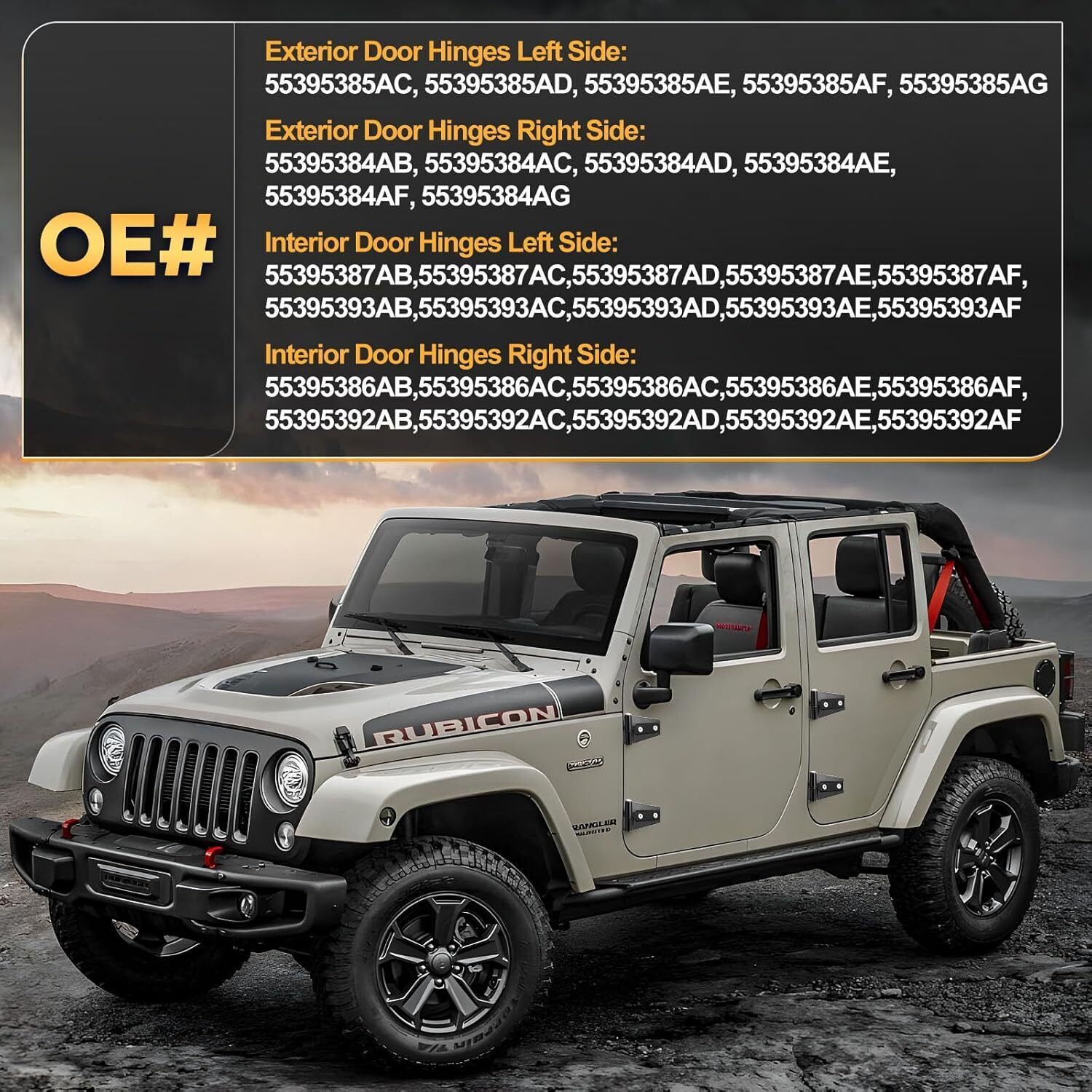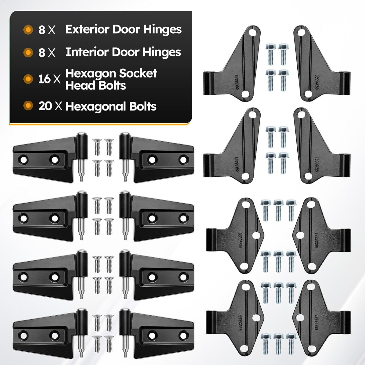 ?Compatible with: For 2007-2018 Jeep JK Jeep Wrangler. Please check the second main picture to confirm door hinge assembly whether compatible with your car. Outside#Lleft: 55395385AC/AD/AE/AF/AG, right:55395384AC/AD/AE/AF/AG. Inside#Left: 55395387AB/AC/AD/AE/AF, 55395393AB/AC/AD/AE/AF, right: 55395386AB/AC/AD/AE/AF, 55395392AB/AC/AD/AE/AF. ?Excellent Function: Ensure and maintain the door position relative to the body, facilitates the door opening and closing, prevent rattling or unwanted movement while driving. ?High-quality: The inside outside door hinge made of aluminum alloy with a matte black rust-resistant coating, aluminum alloy pin, stainless steel hexagon socket head bolts, with higher hardness, less wear and corrosion, and longer service life, can withstand long-term use and providing excellent rust protection. ?Package included: 8x Exterior Door Hinges, 8x Interior Door Hinges, 16x Hexagon Socket Head Bolts, 20x Hexagonal Bolts. Not included instruction manual, easy to install. ?After-Sales Service: We offer 24 hours customer service and 1 year product service, If you are encounter product installation, product quality and other problems, please feel free to contact us.