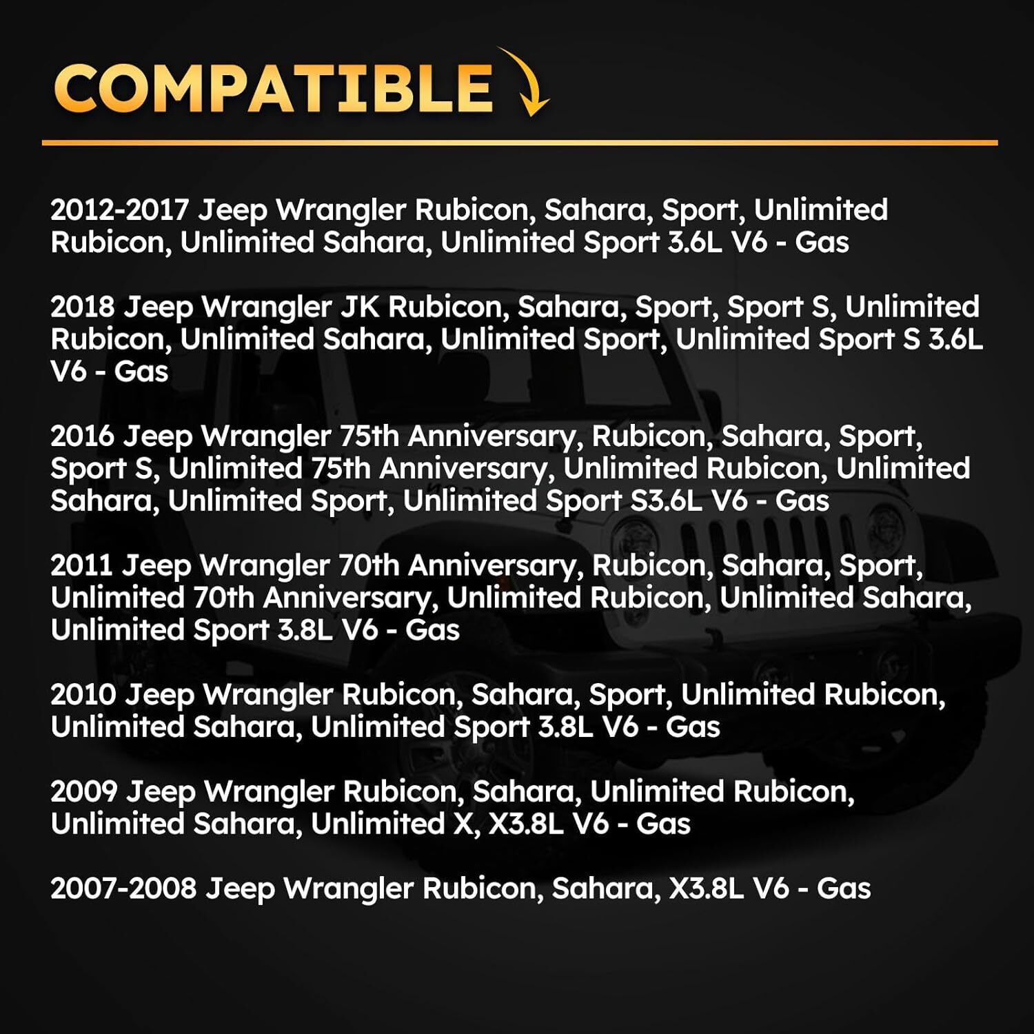 For 2018 Jeep Wrangler JK Rubicon, Sahara, Sport, Sport S, Unlimited Rubicon, Unlimited Sahara, Unlimited Sport, Unlimited Sport S 3.6L V6 - Gas