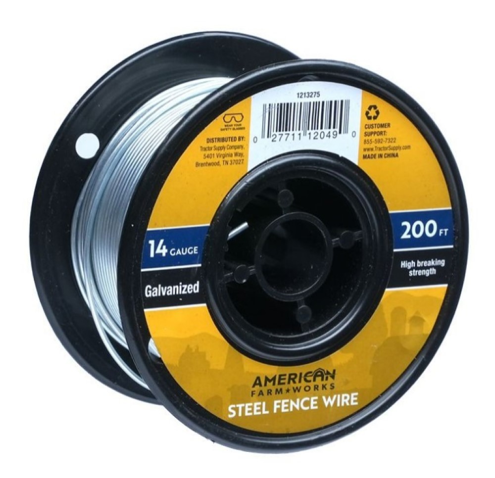 Basic, economical fence wire suits all standard electric fencing needs Compatible with plastic or porcelain insulators on all fence post types Crafted from durable galvanized steel Coil contains 200 ft. of American FarmWorks 14 gauge wire Breaking load: 698 lb. Tensile strength: 150,000 PSI Please note: Always handle American FarmWorks fence wire coils with caution and wear appropriate safety gear, including gloves and safety glasses.