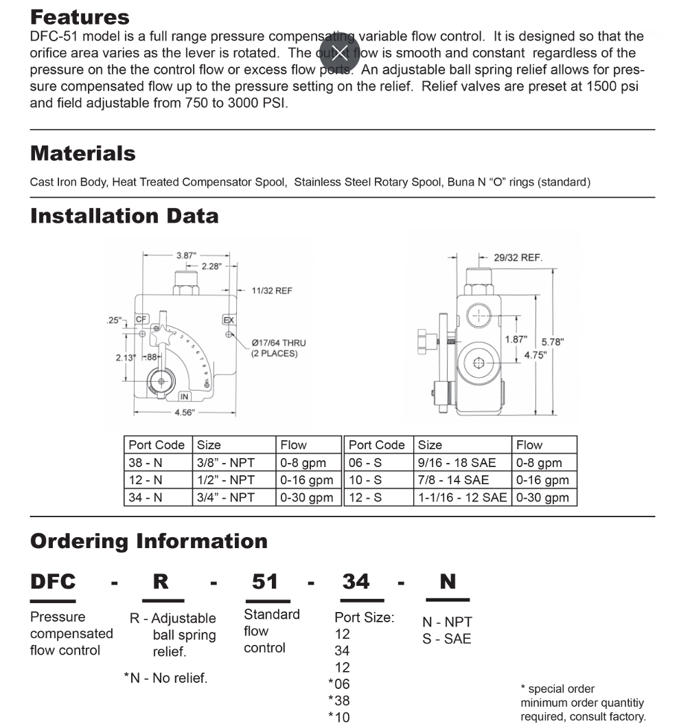 The Chief 3,000 PSI FC Series Hydraulic Valve is made of durable cast iron. This hydraulic valve offers a 750 to 3,000 PSI relief and 0 to 30 GPM flow rate. The high-pressure relief valve provides 3/4 in. NPT/side ports and is pressure compensated. With help from a Chief hydraulic valve, you'll be able to get the right setup for your needs.Note: This product may require up to 2 additional days for order processing prior to shipping