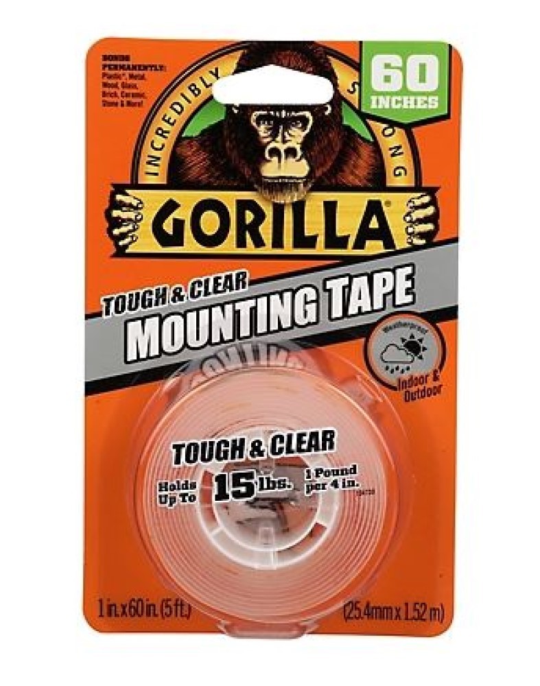 Gorilla Tough Clear Mounting Tape is a clear double-sided tape that mounts in an instant, for a permanent, weatherproof bond. The crystal clear adhesive tape won't yellow over time, and holds up to 15 pounds! Gorilla Tough Clear Mounting Tape is perfect for indoor and outdoor projects and sticks to smooth and rough surfaces. Completing DIY projects is easy with this tough, double sided tape. Mount, build, and repair!