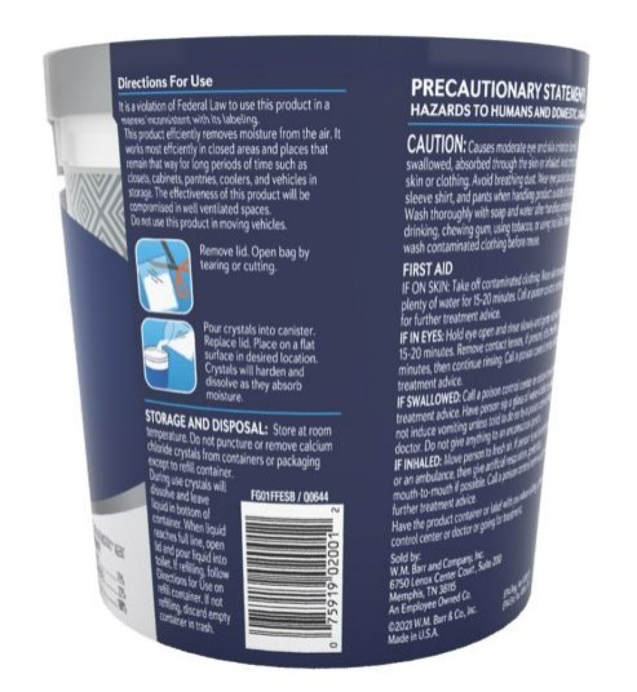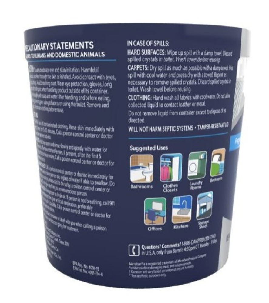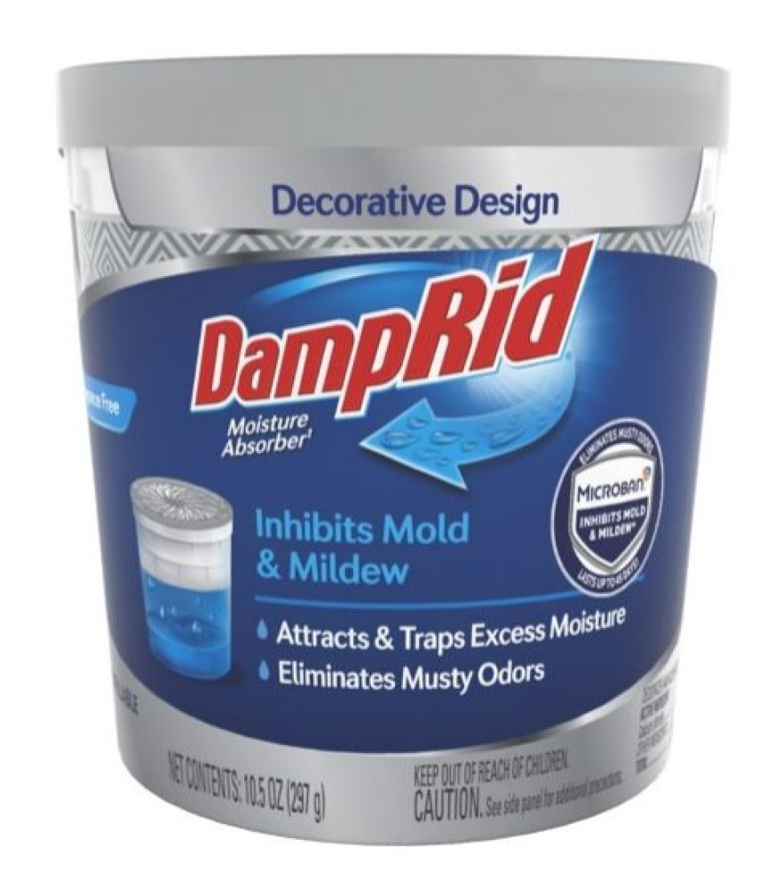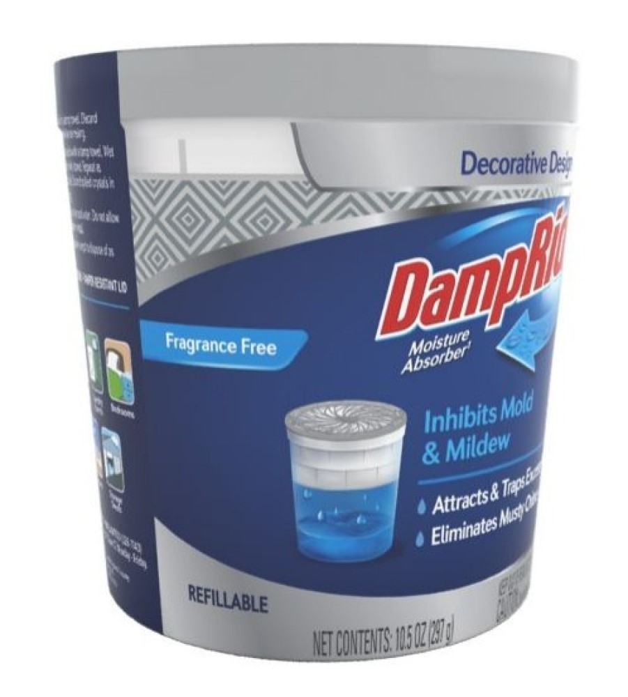 DampRid moisture absorbing cup attracts and traps excess moisture to eliminate musty odors Inhibits mold and mildew with the power of MICROBAN Decorative design allows the moisture absorber cup to blend in with home decor DampRid 10.5 oz. Refillable Fragrance-Free Moisture Absorbers attract and trap excess moisture eliminating musty odors for fresher air Watch DampRid work as it attracts and traps moisture out of the air Refillable cup lasts up to 45 days depending on temperature and humidity level Great for use in closets, bathrooms, laundry rooms, pantries, under sinks, and anywhere excess moisture and stagnant air are a problem When the cup is full of water, just pour the liquid out and refill with more calcium chloride crystals Keep out of reach of children Do not use in moving vehicles. Do not allow product to contact leather or metal. Do not allow product to contact leather or metal Eye irritant and harmful if swallowed