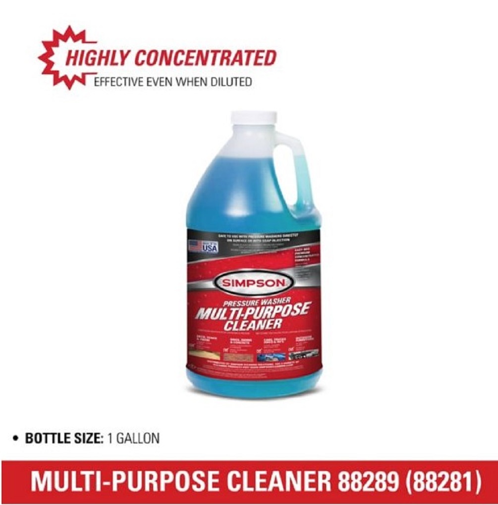 Heavy-duty pressure washer cleaner outperforms every all-purpose cleaner on the market. Non-butyl degreaser Cleans everything, faster, easier, and more economically Versatile cleaner cleans any washable surface Highly concentrated and effective at dilutions as great as half-ounce per gal of water; a real money saver Works in hard or soft water so you can get to cleaning with whatever water you have on hand One product to do all the cleaning so you can get your cleaning done quicker and cheaper Free rinsing for your convenience Eliminates the need to use several other products to get the cleaning done, speeding up your cleaning routine Never leaves a film on any surface so you never have to go over something twice This SIMPSON Multi-Purpose Cleaner has been formulated for difficult cleaning jobs. It is simply the best all-purpose cleaner. This unique power detergent will outperform every all-purpose cleaner on the market today.