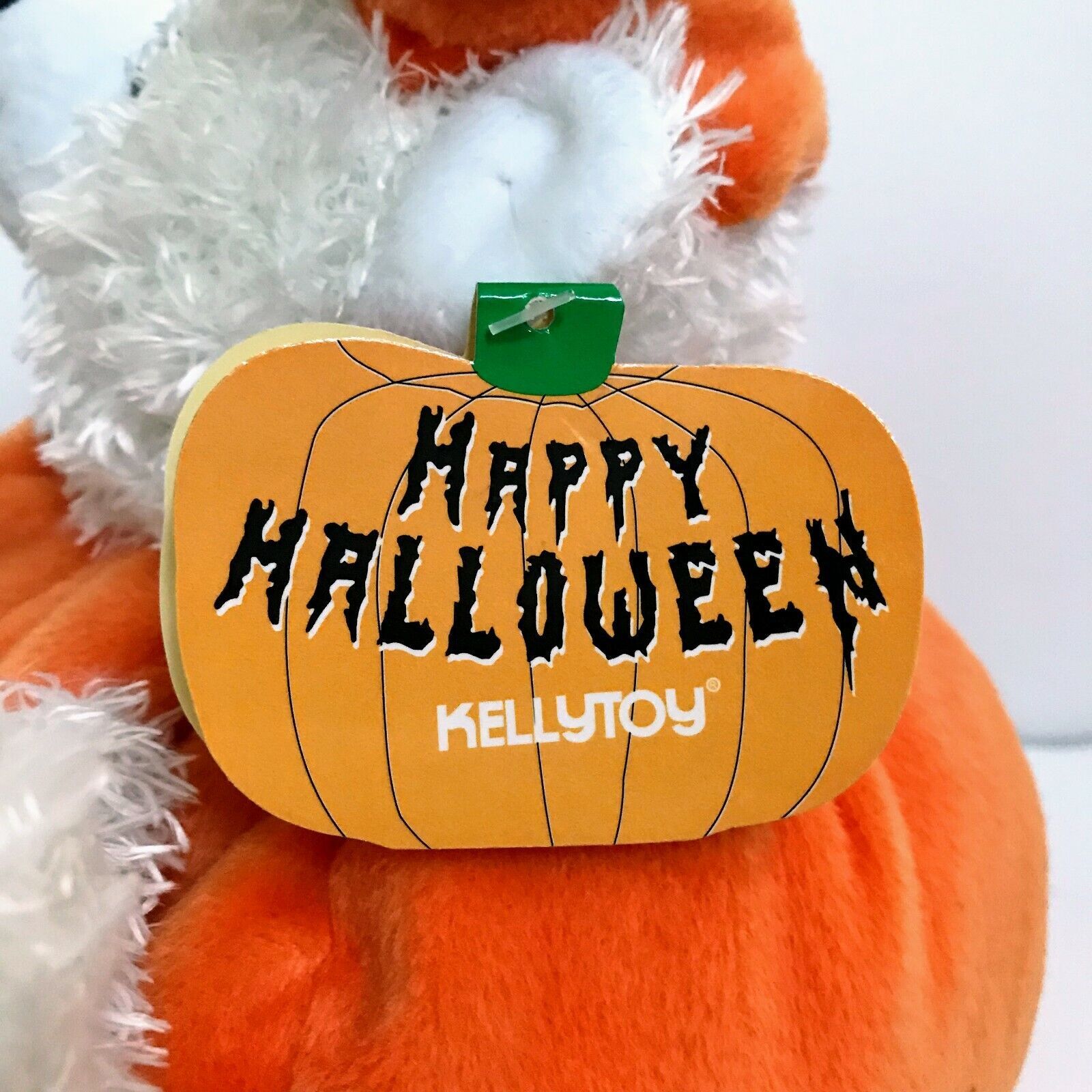 Kellytoy Halloween Pumpkin Bear Plush White Fur Stuffed Animal Toy Vintage 14" Beanbag