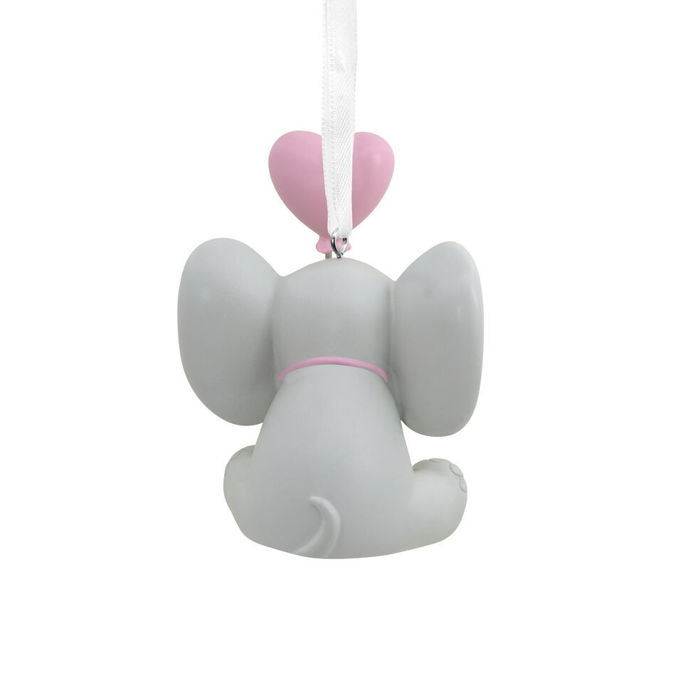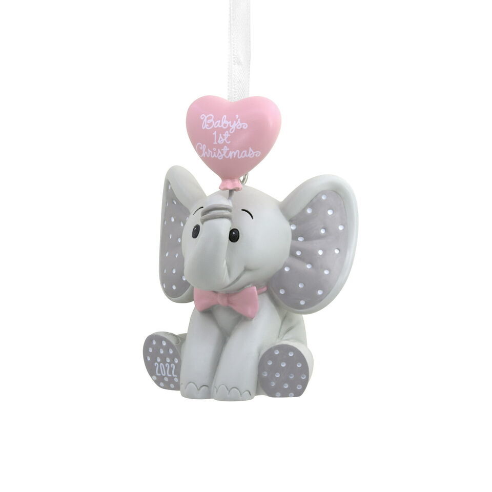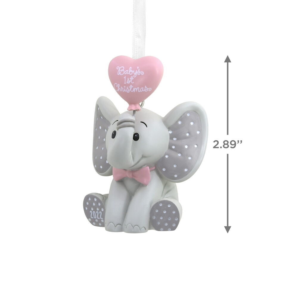 Christmas ornament features an elephant with a pink bow tie and balloon, and year-dated 2022 Baby's 1st Christmas message.