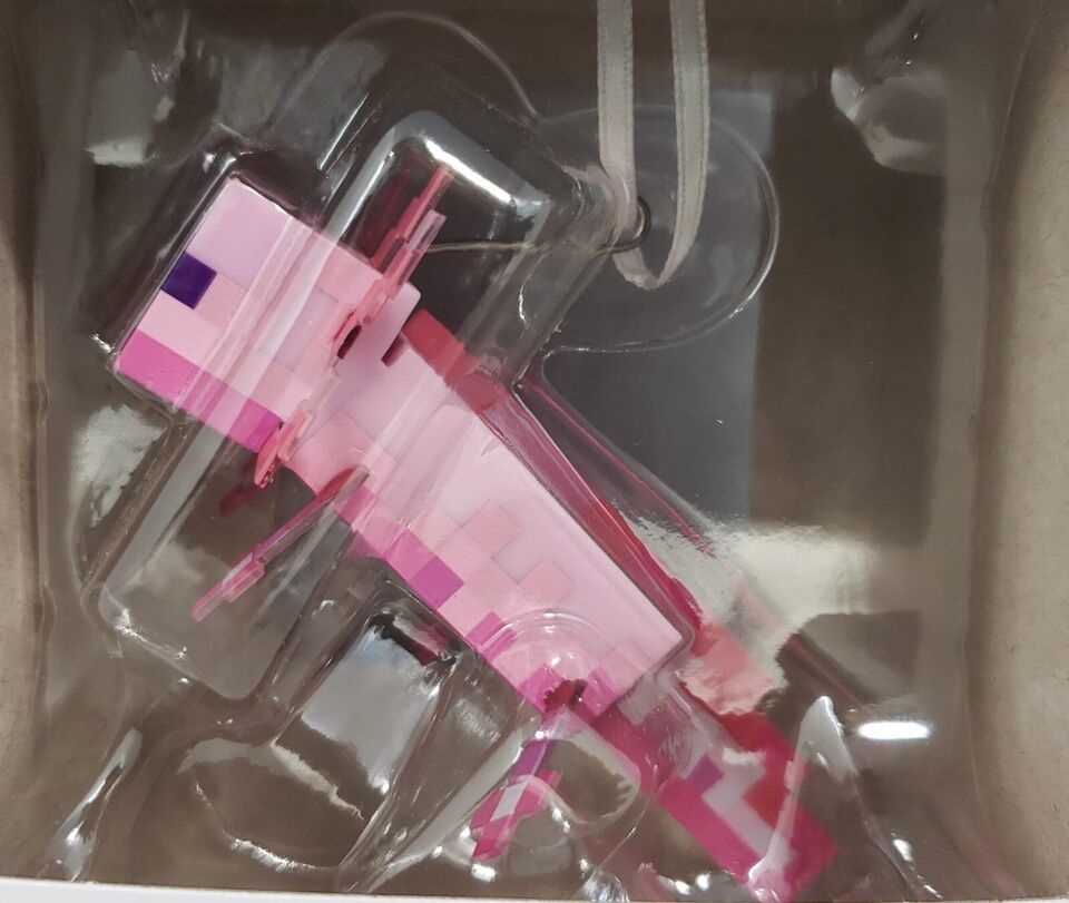 Give a nod to a mob that plays dead and regenerates with this Minecraft Axolotl Hallmark Christmas ornament. Features the pink salamander with a pixelated tail from the popular video game.