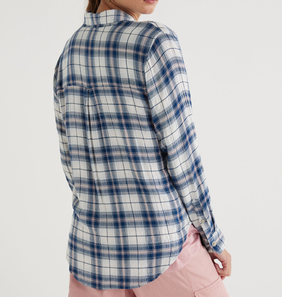 Features: Soft crinkled woven fabric; high-low shirttail hem; drop yoke with inverted pleat in back; allover plaid pattern