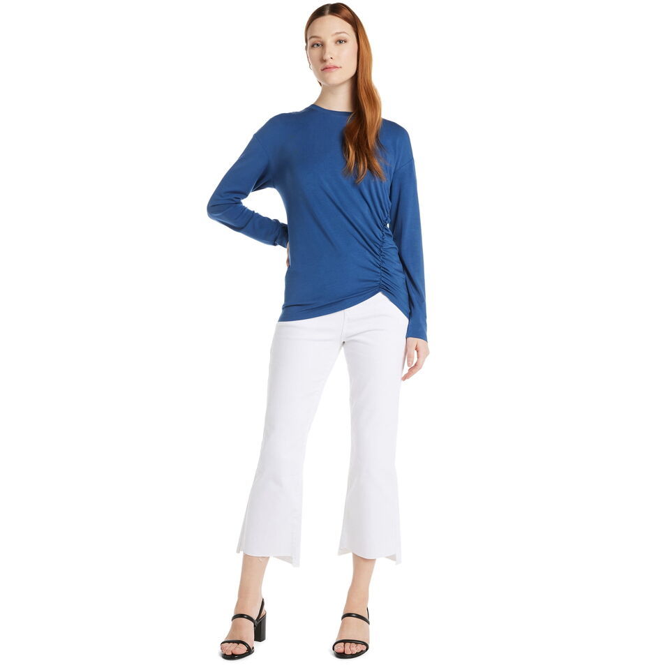 This chic Ruched Top from Time and Tru turns up the volume on casual style. Crafted in a super-soft jersey, this knit top features a slight high-low hem and ruched side detail. It's versatile, comfortable and sure to make a statement, elevating your favorite denim looks for weekend get-togethers and pairing with the latest wide-leg pants for an office-ready outfit.
