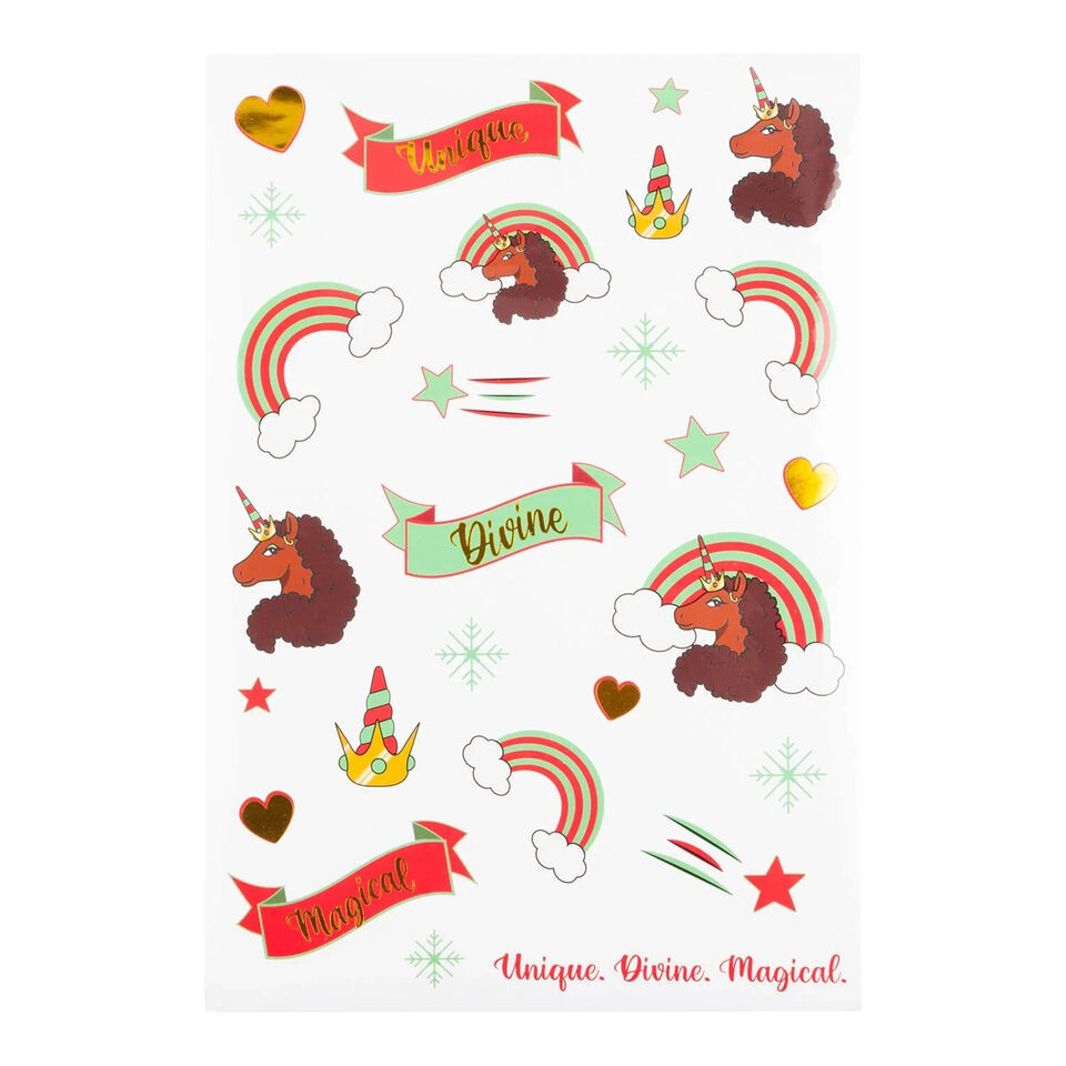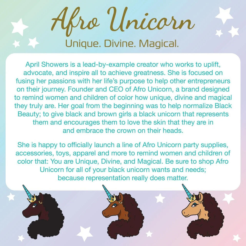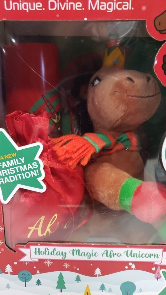 Afro Unicorn Unique the unicorn is an extra set of eyes to help sprinkle around some holiday magic that will inspire kids to show acts of kindness. Each Holiday Magic Unicorn Plush includes a DYI calendar, stickers, plush, and a surprise gift to help encourage kids to be their most magical and divine selves throughout the holiday season.