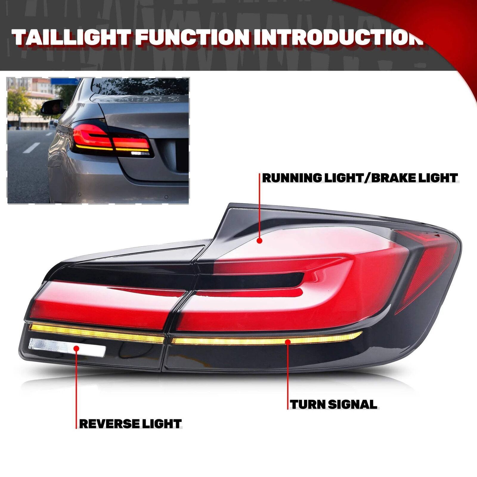 Upgrade your BMW 5 Series F10 or F18 with these high-quality LED tail lights, designed to enhance your vehicle?s style and functionality. These rear lamps offer sequential turn signals, a clear lens, and premium waterproof housing for durability in all weather conditions. The direct plug-and-play installation ensures a hassle-free upgrade with no extra parts needed. Built to DOT and SAE certifications, these tail lights provide excellent visibility and safety for your car. Crafted from durable ABS and PC materials, these lights are a perfect replacement for your factory tail lights, adding a modern touch to your vehicle. Brand-new LED tail lights designed for BMW 5 Series F10 and F18 models from 2011 to 2017. Easy plug-and-play installation with factory plugs and harness included. Sequential turn signal and DRL features for enhanced style and safety. Durable waterproof design with IP67 rating to handle all weather conditions. Package includes one pair of tail lights (driver and passenger sides) with harness for quick setup.
