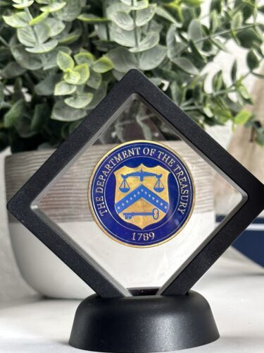 This is a great looking United States Department of the Treasury challenge coin. Coin has reeded edges and is about 1 9/16" in diameter. All details are raised lettering and gold plated. Coin is contained in a 3D display case.