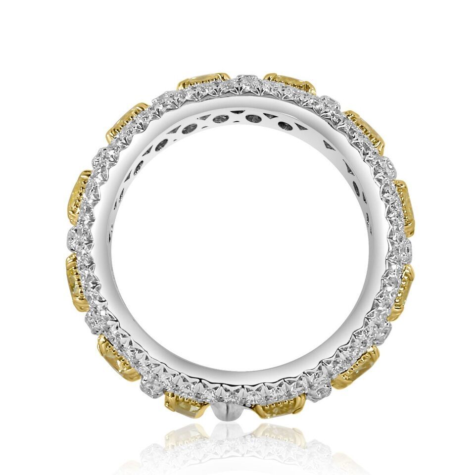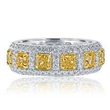 Spectacular one of a kind wedding band will add magic to special moment!! This art deco design eternity wedding band features 12 cushion cut natural fancy yellow diamonds individually edged in colorless micro pave halo. Handcrafted in 14k white and yellow gold completed with a high polish. The total carat weight is 4.01 carats. This is amazing gift for your lovely one!