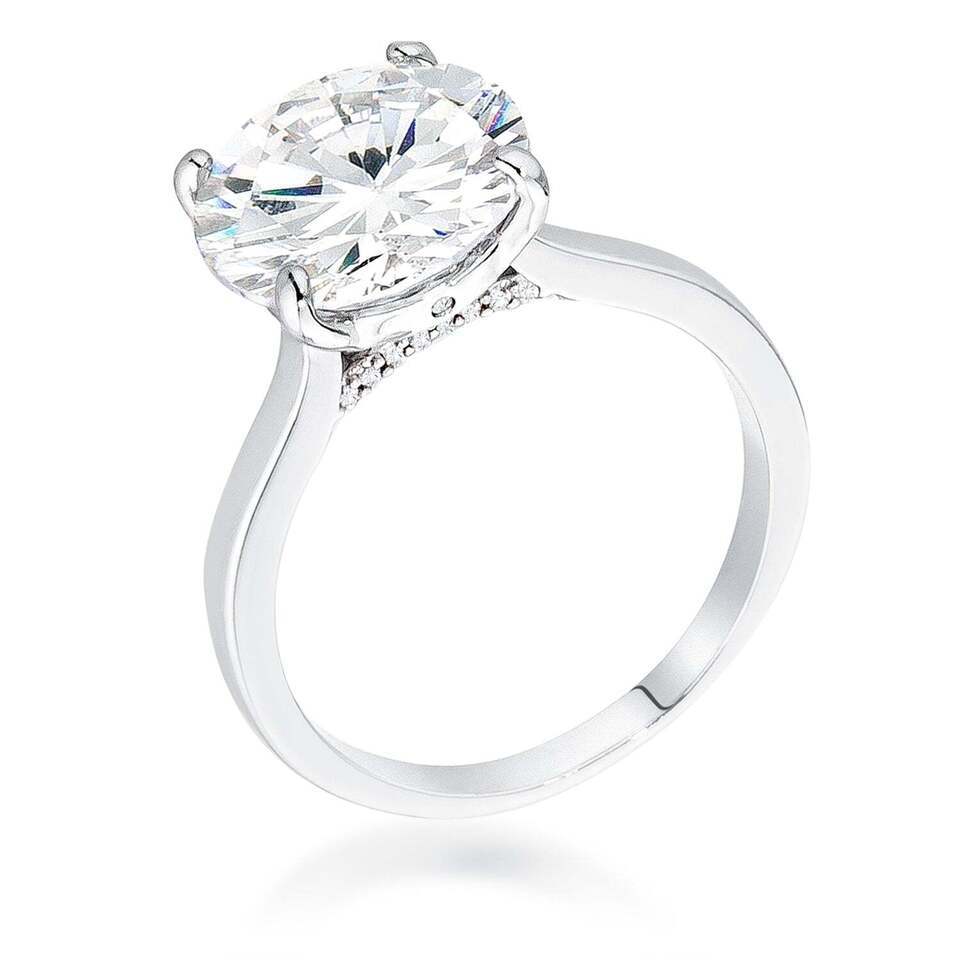 Feel like a pop sensation with reason to celebrate with this brilliant rhodium plated solitaire engagement style ring. We're keeping the focus on a beautifully cut 5 carat clear round stone made of Cubic Zirconia to create a minimal yet alluring design. Secured with 4 prongs a petite row of 8 miniature 1ct stones sits opposite one another and accompanied with 6 additional bezel cut round stones to raise its feature beauty to great heights. Details: