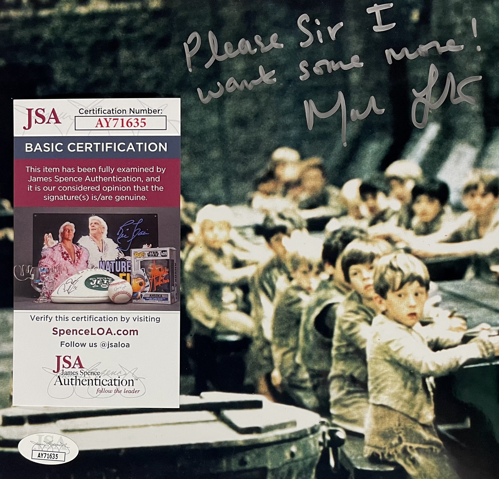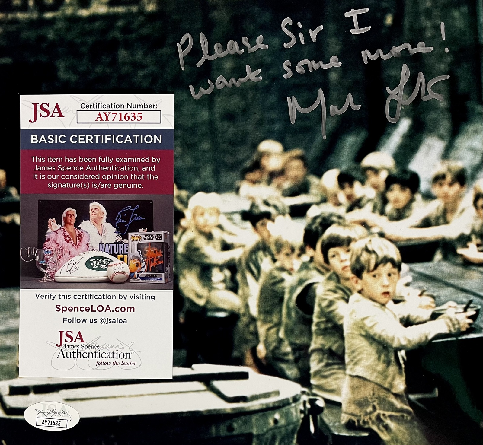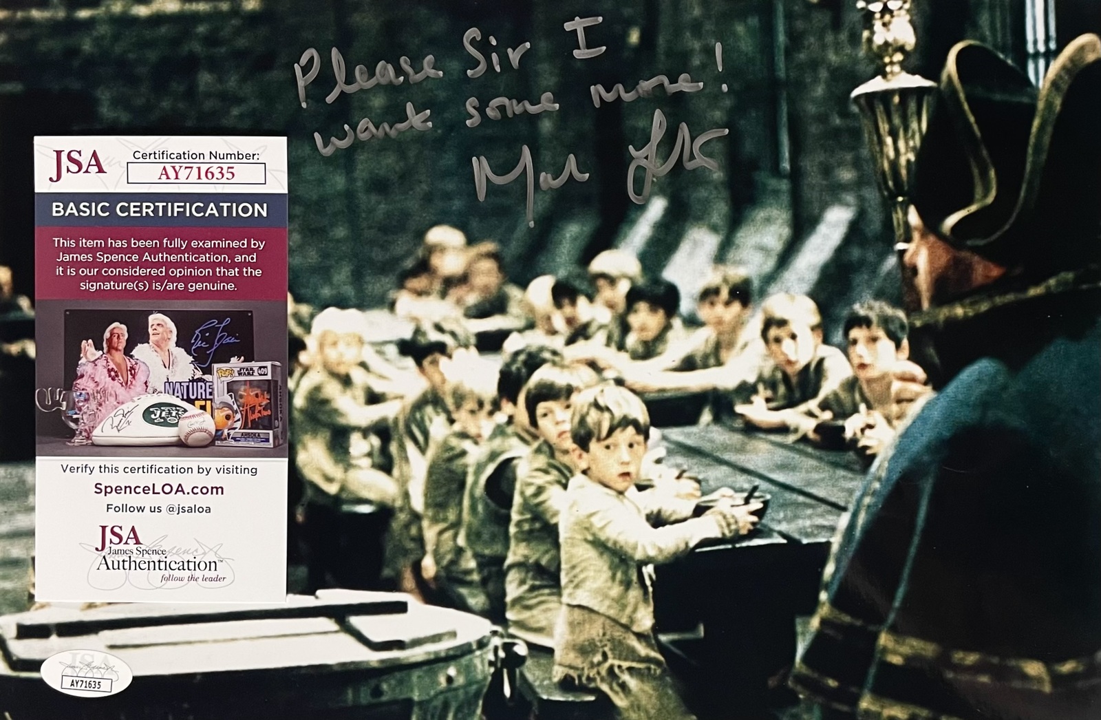 Mark Lester autographed 8" x 12" Oliver! photo signed in silver paint pen and inscribed Please Sir I want some more! Mark Lester from the 1968 film as the lead character. This signature has been authenticated by JSA James Spence authentication Certification Number: AY71635 and will come with the matching cert card seen in the scans. He is an English former child actor who starred in a number of British and European films in the 1960s and 1970s. Known for Oliver! (1968), Melody (1971), What the Peeper Saw (1972), The Prince and the Pauper (1977), Black Beauty (1971), Eyewitness (1970), Run Wild, Run Free (1969), Whoever Slew Auntie Roo? (1971), Redneck (1973), The First Time on the Grass (1974), Scalawag (1973), Our Mother's House (1967), The Counterfeit Constable (1964), and others. The photo will come in a clear hard top load for display. Buy with confidence we have been selling autographs since 1992.