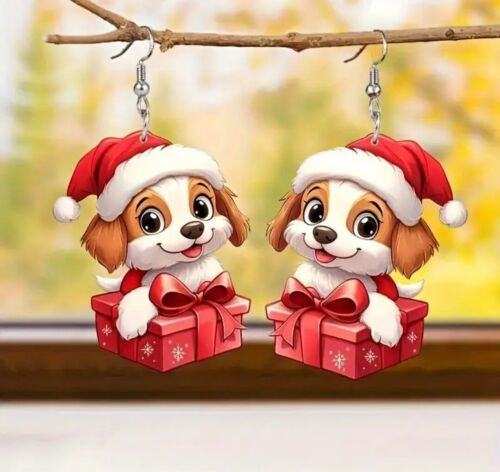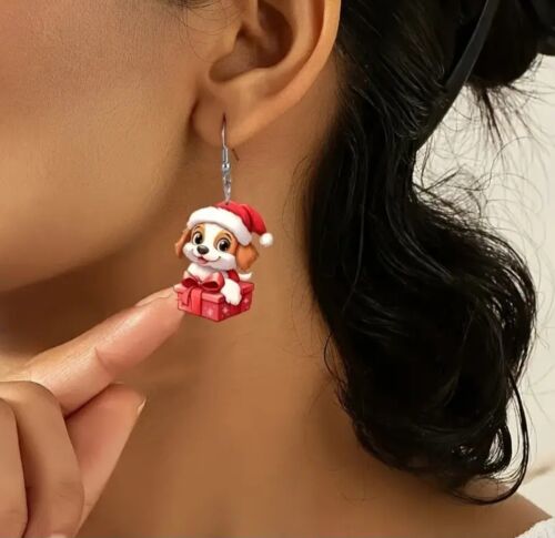 Santa Puppy Dog Wrapped In Present GIFT Earrings Jewelry