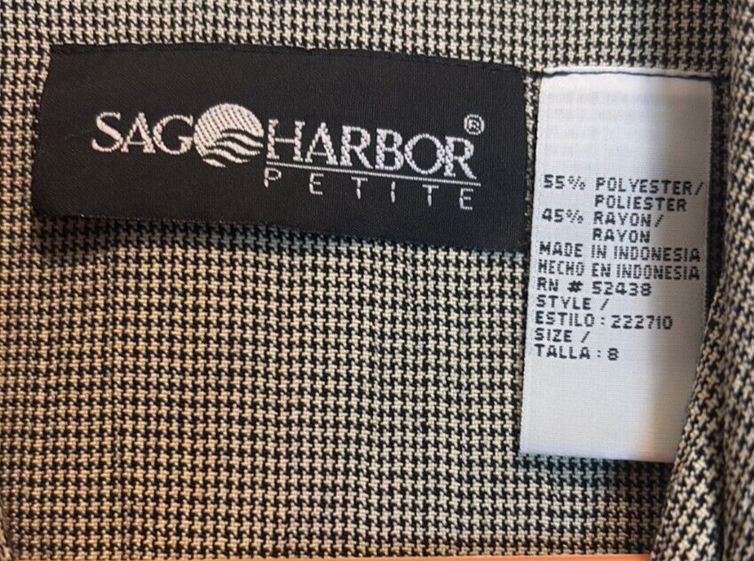 Sag Harbor Petite Women?s Short Sleeve Blazer Top Size S. This nice career piece is 55% Polyester, 45% Rayon and machine washable. Armpit to armpit measures 19?. Shoulder to hem is 23?. Very Good Used Condition - See photos for further description.