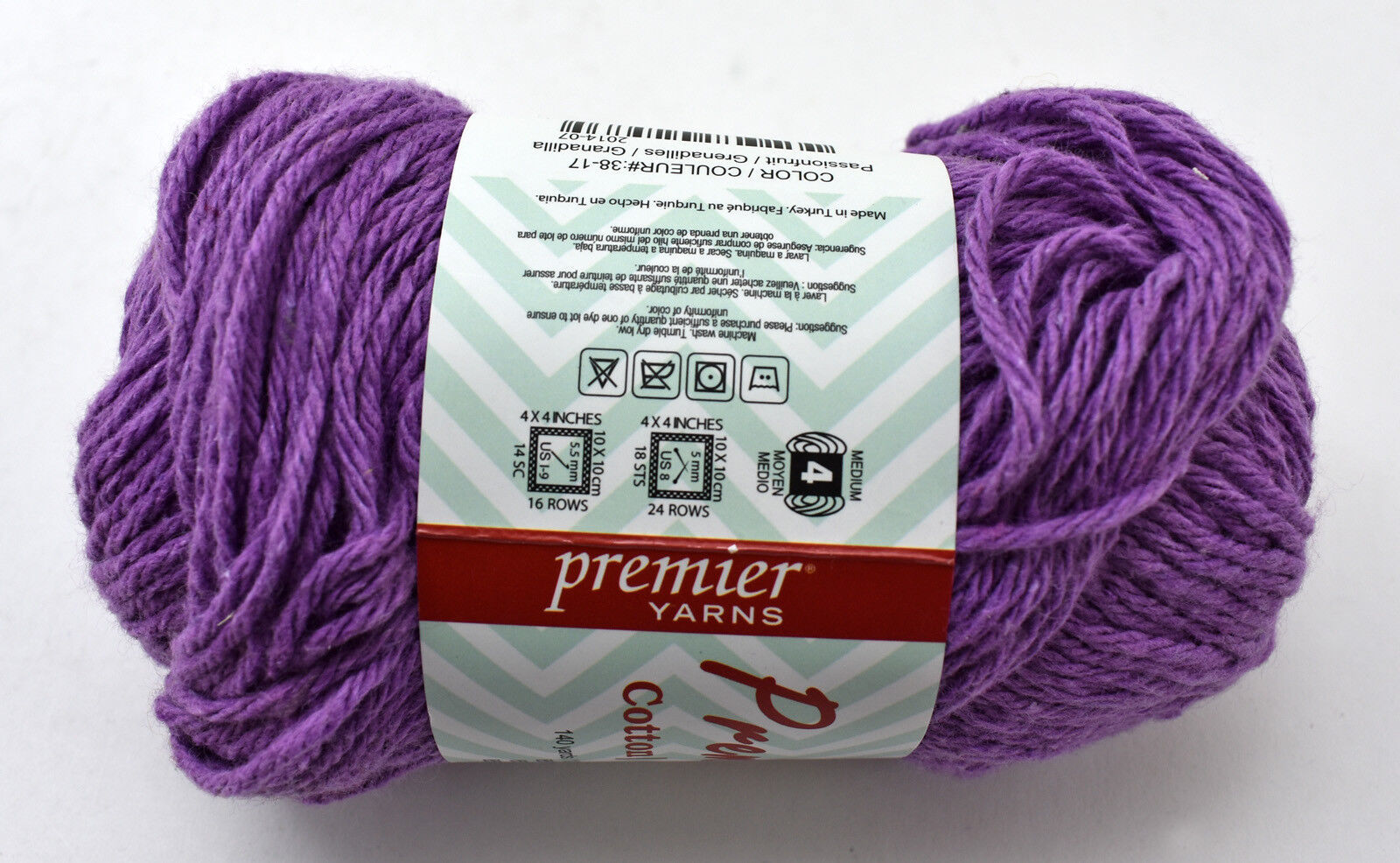 One skein of Premier Yarns Premier Home yarn. Color Passionfruit #38-17, Lot #1023. 85% cotton, 15% polyester; machine wash and dry. Made in Turkey.