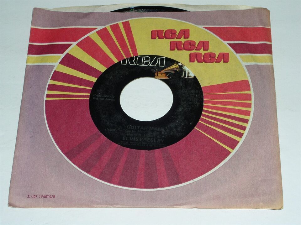 This is a vintage 45 rpm phonograph record by Elvis Presley entitled, "Guitar Man". Flipside: "Faded Love". Record label RCA PB-12158. Comes with its original RCA Records paper sleeve as shown.