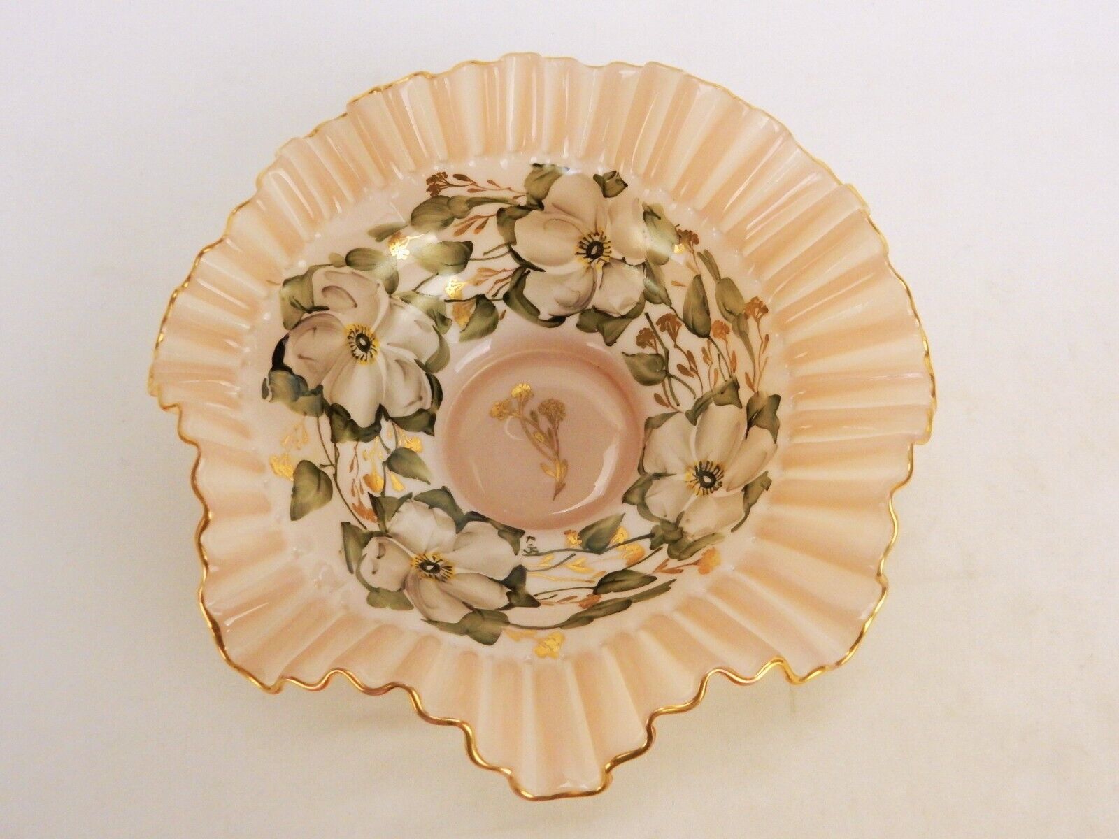 Vintage Hand Painted Bowl, Fenton Art Glass Gilded Pink Ruffled Rim, Magnolias