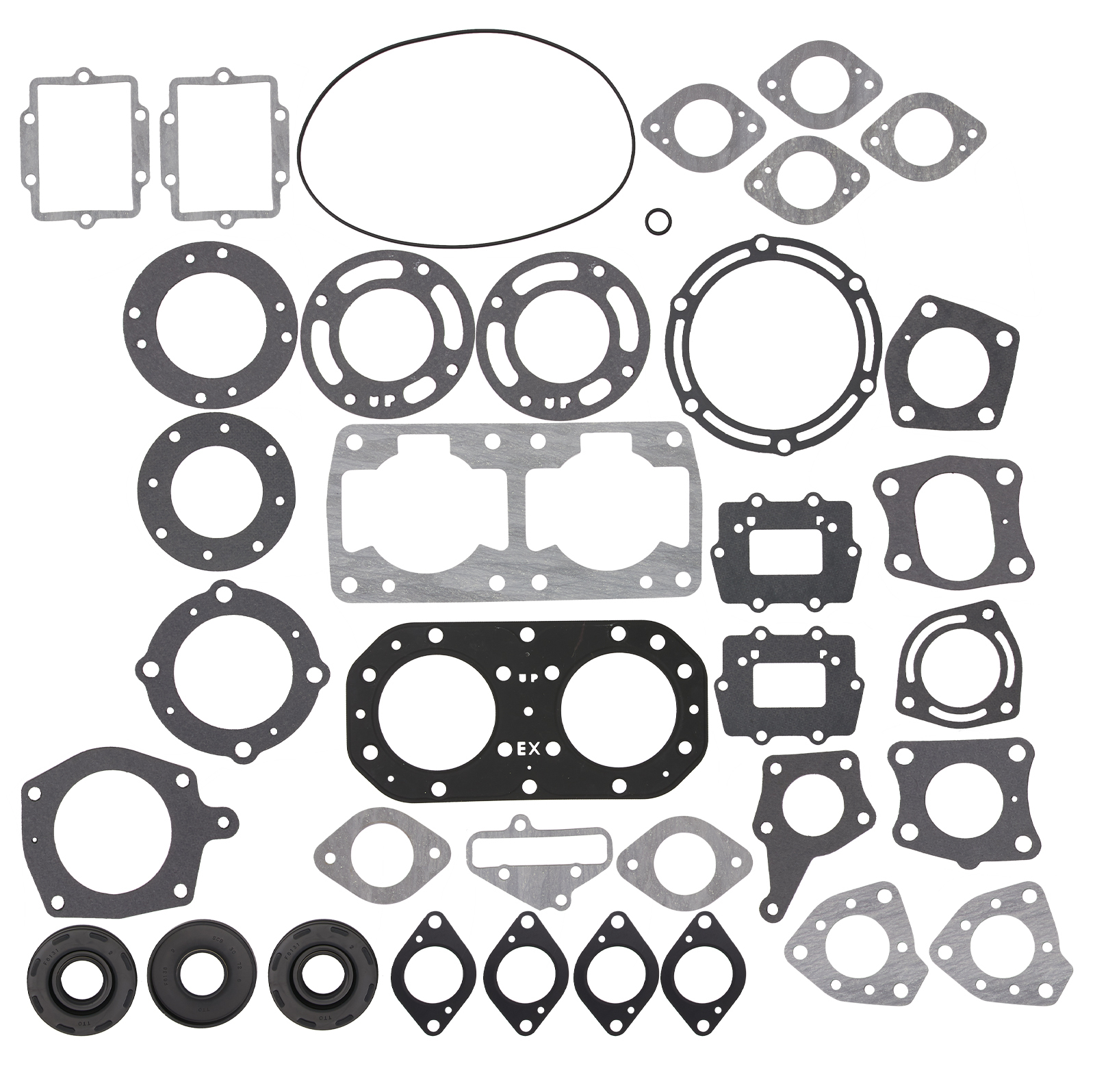 Kit Includes: Carburetor Base Gasket - Qty 2 Flywheel Cover O'Ring - Qty 1 Case Drain Gasket - Qty 1 Exhaust Pipe 2 Gasket - Qty 1 Exhaust Pipe 3 Gasket - Qty 1 Intake Manifold Gasket - Qty 2 Exhaust Manifold Gasket - Qty 2 Head Pipe Gasket - Qty 1 Exhaust Pipe 1 Gasket - Qty 1 Exhaust Pipe 2 Gasket - Qty 1 Carburetor Base Gasket - Qty 4 Intake Manifold Gasket - Qty 2 Head Pipe Gasket - Qty 1 Muffler Gasket - Qty 1 Exhaust Pipe 1 Gasket - Qty 1 Exhaust Pipe 2 Gasket - Qty 1 Head Pipe Gasket - Qty 1 Head Pipe Gasket - Qty 1 Carburetor Base Gasket - Qty 4 Connector Pipe Gasket - Qty 1 Front Oil Seal - Qty 2 Rear Oil Seal - Qty 1 Head Gasket - Qty 1 Base Gasket - Qty 1 Seal Collar O'Ring - Qty 1