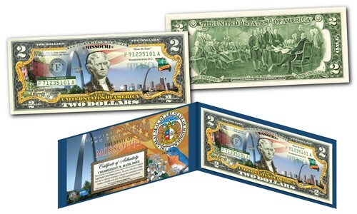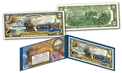 Celebrate America with the popularity of the statehood series with these colorized $2 bills. Each bill features the state's name, bird, flower, nickname, emblem, year of admission, and State Quarter graphic. The State Quarter featured on the bill is an actual watermark security feature?the first of its kind! Americans from all over the country are rushing to obtain the new ?Statehood? Genuine Two Dollar bills, while they last. The coveted U.S. Government $2 bill is rarely seen in circulation and only banks and currency dealers may obtain special uncirculated bills directly from the Federal Reserve Bank. Now for the first time ever these enhanced uncirculated full color two dollar bills are available exclusively from this limited time offer. Two dollar bills are among the most beautiful of all U.S. circulating currency and now the rarely circulated $2 bill is even rarer with exclusive overlay of our beautiful States. Each Bill comes with a full-Color Certificate of Authenticity handsomely displayed in a Special Gold Foil Museum-Quality Folio. Don?t Miss Your Chance to Order?.Very Limited Quantity Available!